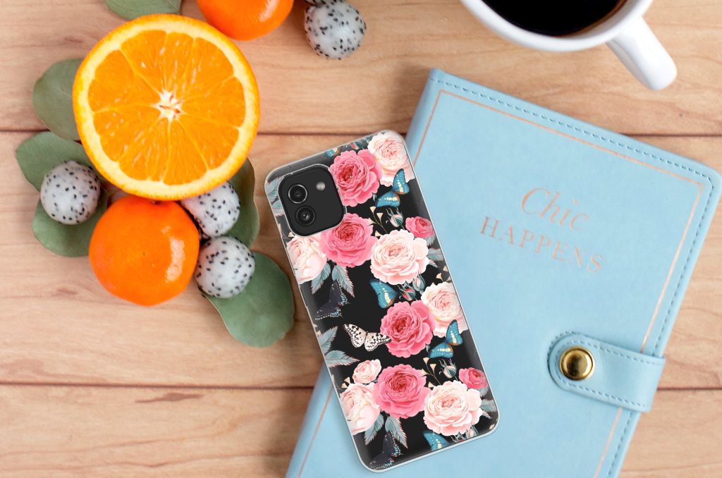 Ben je op zoek naar een uniek telefoonhoesje voor je Samsung Galaxy A03? Dan ben je bij B2C Telecom aan het juiste adres! Speciaal voor jou hebben we dit prachtige Butterfly Roses design in onze collectie hoesjes opgenomen. Het design wordt bedrukt op een TPU Case en is gemaakt van flexibel rubber. Het design wordt alleen aan de bovenkant van het hoesje bedrukt en de randen blijven transparant. Aan de zijkanten zijn uitsparingen gemaakt waardoor je met gemak alle knoppen en poorten kunt bedienen. Wij adviseren om dit hoesje in combinatie met een screenprotector te gebruiken voor een langere levensduur van je telefoon. Wil je dit design hoesje nog iets extra's geven? Voeg dan gratis je naam of een quote toe! Is dit design hoesje toch niet helemaal wat je zocht? Ontwerp dan zelf een hoesje in ons ontwerpprogramma.