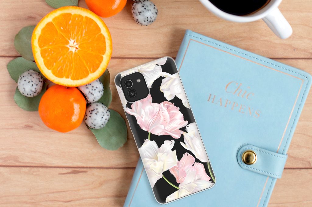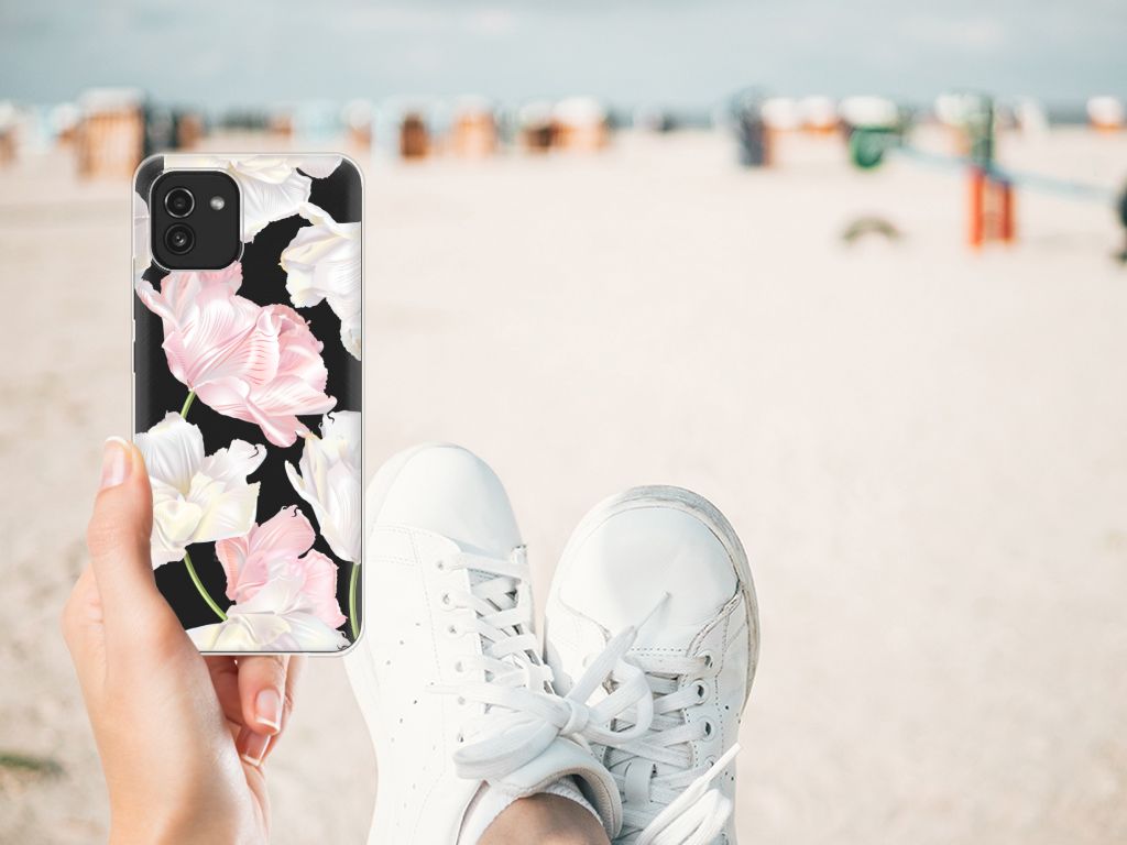 Een bosje bloemen doet een mens (en zijn smartphone) goed. De witte en roze bloemen op deze Samsung Galaxy A03 TPU Case geven jouw smartphone een zeer mooie uitstraling. Je wordt er ook meteen een stuk rustiger van als je aan het appen of aan het bellen bent. Valt dan je telefoon op de grond, dan zal er dankzij de tpu case met het design Lovely Flowers ontstaan. Helemaal niet als je er een screenprotector bij hebt gekocht. Onze tpu cases met roze en witte bloemen zien er zeer prettig uit en zijn heel praktisch, getuige onder meer de opstaande randen en het flexibele materiaal. Alleen de achterkant van de tpu case wordt bedrukt met roze en witte bloemen. Op deze tpu case kun je trouwens ook een eigen ontwerp zetten. In een paar simpele stappen ontwerp je zelf een stand case met daarop jouw favoriete bloemen.