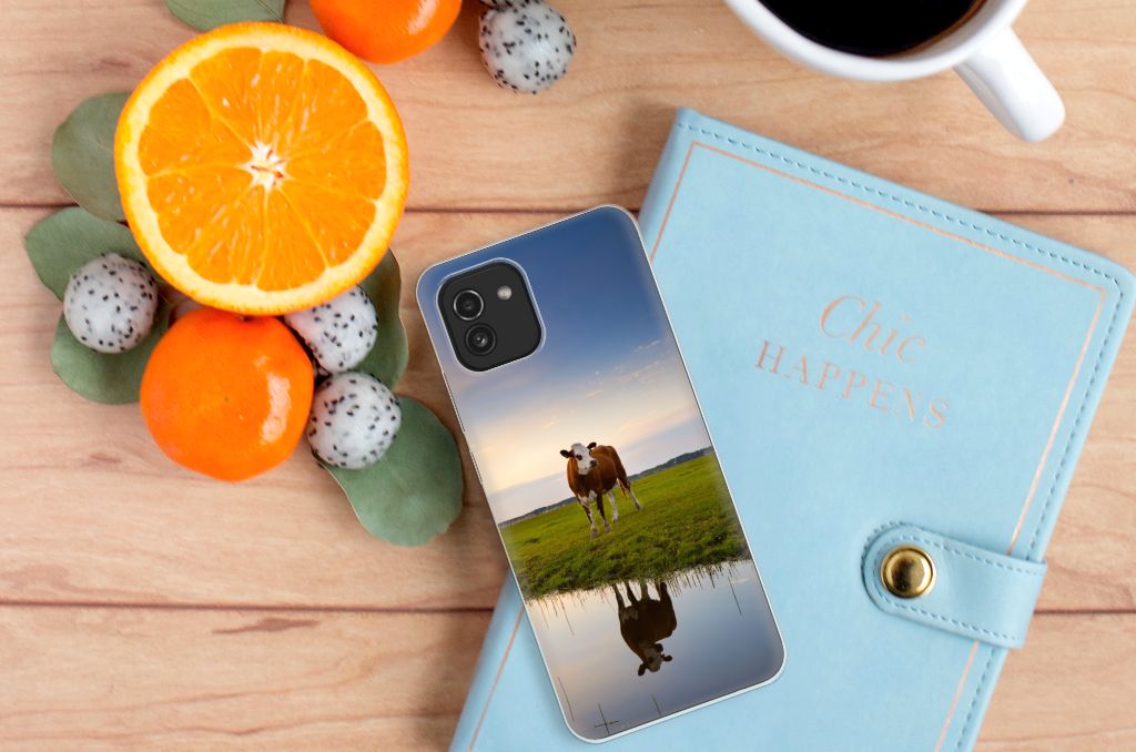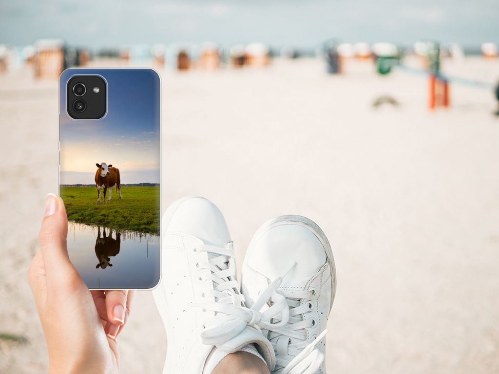 Het levert een idyllisch plaatje op, dit hoesje met een koe en ondergaande zon op de achtergrond. Door een koe buiten te laten lopen en grazen, hebben ze minder kans om ziek te worden. De Koe graast het liefst met soortgenoten, al zijn deze een stukje van de koe op de case verwijderd. Dit levert ook een mooi plaatje op, zoals je kunt zien op dit design hoesje. Dit tpu hoesje met koeien ziet er flexibel uit en is voorzien van alle uitsparingen. Een Samsung Galaxy A03 TPU Hoesje met koeien beschermt jouw smartphone vooral aan de achterkant en zijkanten. De zijkanten blijven transparant, de rest van het hoesje is bedrukt. Koeien herkauwen het liefst liggend, behalve wanneer het regent. Zo goed als grazen voelt voor koeien, zo duurzaam zal jouw smartphone blijven met dit design hoesje. Het TPU is schokabsorberend en niet te breken. De TPU case past altijd in je broekzak.