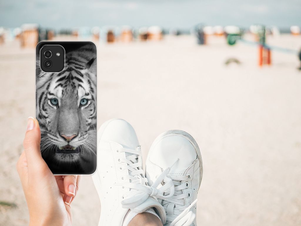 Omdat de Witte Tijger zo bijzonder is, zijn wij bereid deze voor zeer lage kosten op een tpu case te zetten. Dit kunnen we zo goedkoop doen omdat we het drukwerk in eigen beheer doen. Witte tijgers leefden lange tijd in de bossen van India, Bangladesh, Nepal, Bhutan en China en kunnen wel 257 kilo wegen. Dit zwaargewicht kunnen we bedrukken op verschillende soorten hoesjes, zoals deze tpu cases. Deze Samsung Galaxy A03 TPU Hoesje kan exclusief in het bezit van jou komen. Zeker als je er zelf nog unieke teksten en/of beelden aan toevoegt. Het tpu hoesje is zeer flexibel en wordt alleen aan de bovenzijde bedrukt. De randen van dit flexibele hoesje blijven doorzichtig. Tegenwoordig zijn witte tijgers alleen in gevangenschap te bewonderen. Jij zorgt voor een goede bescherming van je smartphone met dit design hoesje met witte tijger.