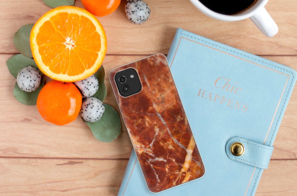 Dit design hoesje met Marmer Bruin is voor de artistieke personen onder ons. De Grieken en Romeinen wisten het al te waarderen door het als bouw- en bekledingsmateriaal toe te passen. Naast het witte Carrara marmer met haar zacht grijze geaderde belijning zijn de diverse soorten in een ruim kleurenpallet te krijgen. We hebben verschillende kleuren op design hoesjes gezet, zoals in dit geval bruin marmer. Dit is een Samsung Galaxy A03 TPU Siliconen Hoesje met marmer in bruine kleur. Het marmer wordt bedrukt op de voorkant van een tpu case, die beschikt over opstaande randen aan de voorkant en heel goed combineert met een screenprotector. De rijkheid aan kleuren en varianties in afwerking geeft ontwerpers de vrijheid om met marmer hele mooie architectonische projecten te realiseren. Wij hebben onze designer ook veel vrijheid gegeven. Het resultaat zie je terug in deze tpu case met bruin marmer, die jouw smartphone goed beschermt. De zijkanten van de case worden niet bedrukt met marmer.