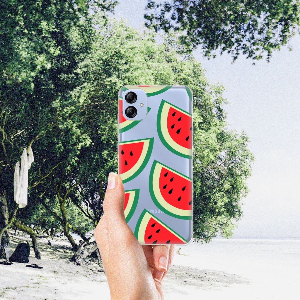 Watermeloenen zijn uitstekende dorstlessers, misschien dat je daarom juist in de zomermaanden extra enthousiast raakt van dit design hoesje Watermelons. Jij blijft gezond als je zo nu en dan een watermeloen neemt, jouw smartphone blijft in tact als je er deze Samsung Galaxy A04e Siliconen Case omheen doet. Deze tpu case wordt alleen aan de bovenkant bedrukt met watermeloenen is zeer flexibel. De randen van het hoesje blijven transparant. Je kunt ook kiezen voor andere soorten fruit op je hoesje. Kijk maar eens naar onze andere design hoesjes op onze website.
