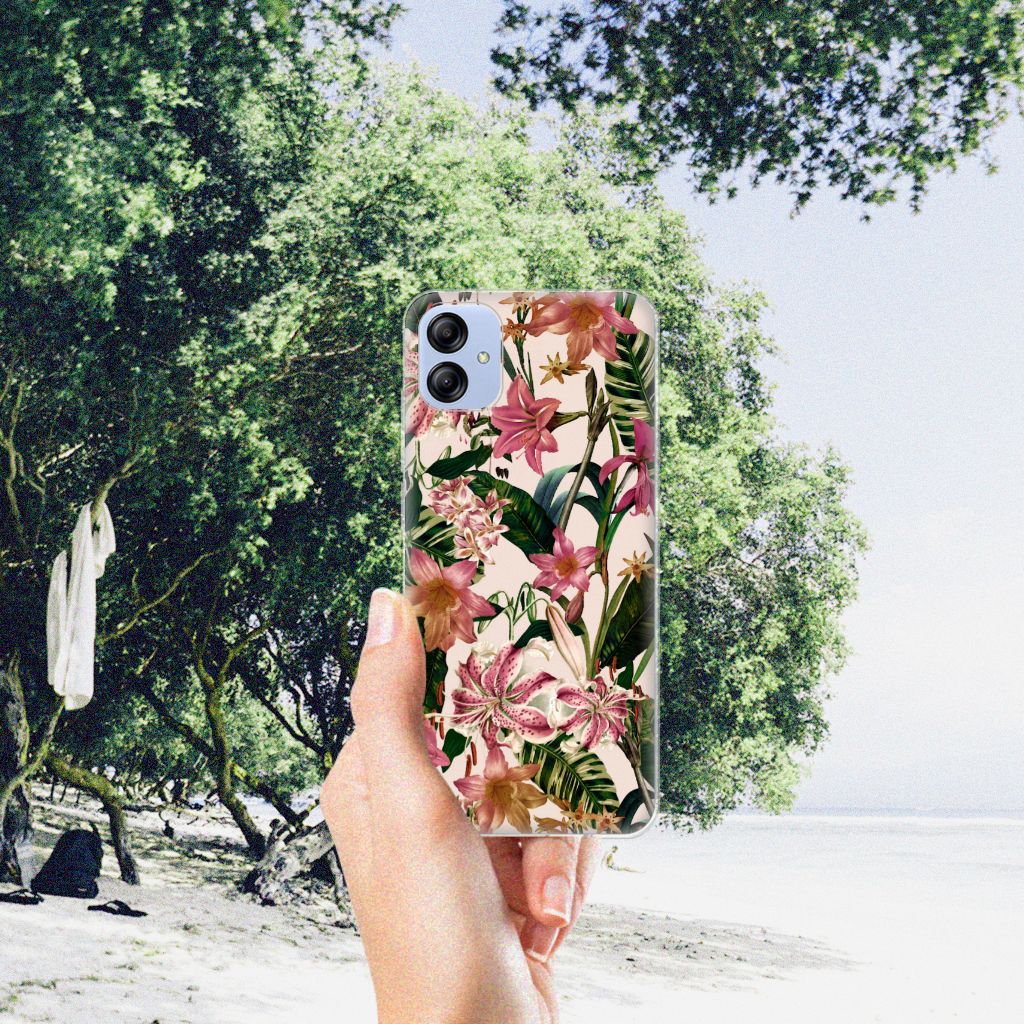 Dit Flowers design is een zegen voor de mens en zijn smartphone. De paarswitte bloemen en groene bladeren op deze Samsung Galaxy A04e TPU Case geven jouw smartphone een zeer sierlijke uitstraling. Je wordt er ook meteen vrolijker van als je aan het appen, mailen of aan het bellen bent. Valt dan je telefoon op de grond, dan zal er dankzij de tpu case met paarswitte bloemen en groene bladeren geen schade ontstaan. Helemaal niet als je er een screenprotector bij hebt gekocht. Onze tpu cases met paarswitte bloemen en groene bladeren zien er zeer prettig uit en zijn heel praktisch, getuige onder meer de opstaande randen en het flexibele materiaal. Alleen de achterkant van de tpu case wordt bedrukt met paarswitte bloemen en groene bladeren, de randen blijven transparant. Op deze tpu case kun je trouwens ook in no time zelf foto’s van jouw favoriete bloemen zetten.