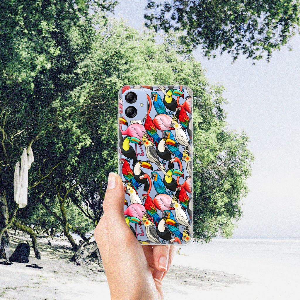 Dit exotische hoesje vol prachtige vogels is een genot voor het oog. Dankzij de felgekleurde toekans, papegaaien, flamingo’s en kaketoes op dit design word je meteen vrolijk als je naar dit hoesje kijkt. Je waant je meteen in de tropen met dit bonte gezelschap tegen een witte achtergrond. Het ontwerp staat op een TPU Hoesje voor de Samsung Galaxy A04e. TPU is een flexibel en onbreekbaar materiaal. Zo is je telefoon aan de achterkant en de randen heel goed beschermd. De case met het birds-design is aan de bovenkant bedrukt, de randen blijven transparant. Het TPU-hoesje is perfect te combineren met een screenprotector. Zo zijn je telefoon en je beeldscherm optimaal beschermd.