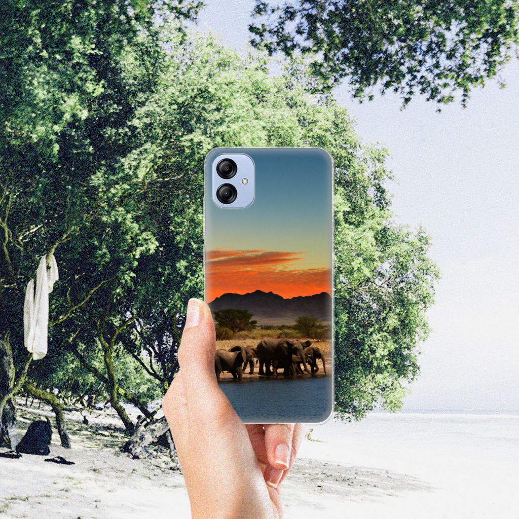 Dit hoesje is zo sterk als een olifant. Dat is goed nieuws, want jouw telefoon heeft een zeer goede bescherming nodig. Dat krijg je met dit design hoesje met print van Olifanten. De Afrikaanse olifant, het allergrootste landdier ter wereld, heeft waarschijnlijk het meest te lijden gehad van stroperij om het ivoor. Deze dieren verdienen dus een goede bescherming, net als jouw smartphone. Met een Samsung Galaxy A04e TPU Hoesje met olifant erop krijg je dit zeker voor elkaar. De tpu case beschermt vooral de achterkant en zijkanten van je telefoon en is gemaakt van onbreekbaar materiaal. De sterke olifant komt zeer goed tot zijn recht op deze case, die zeer flexibel is. Alleen de bovenzijde van de case wordt bedrukt met olifanten, de zijkanten blijven transparant.