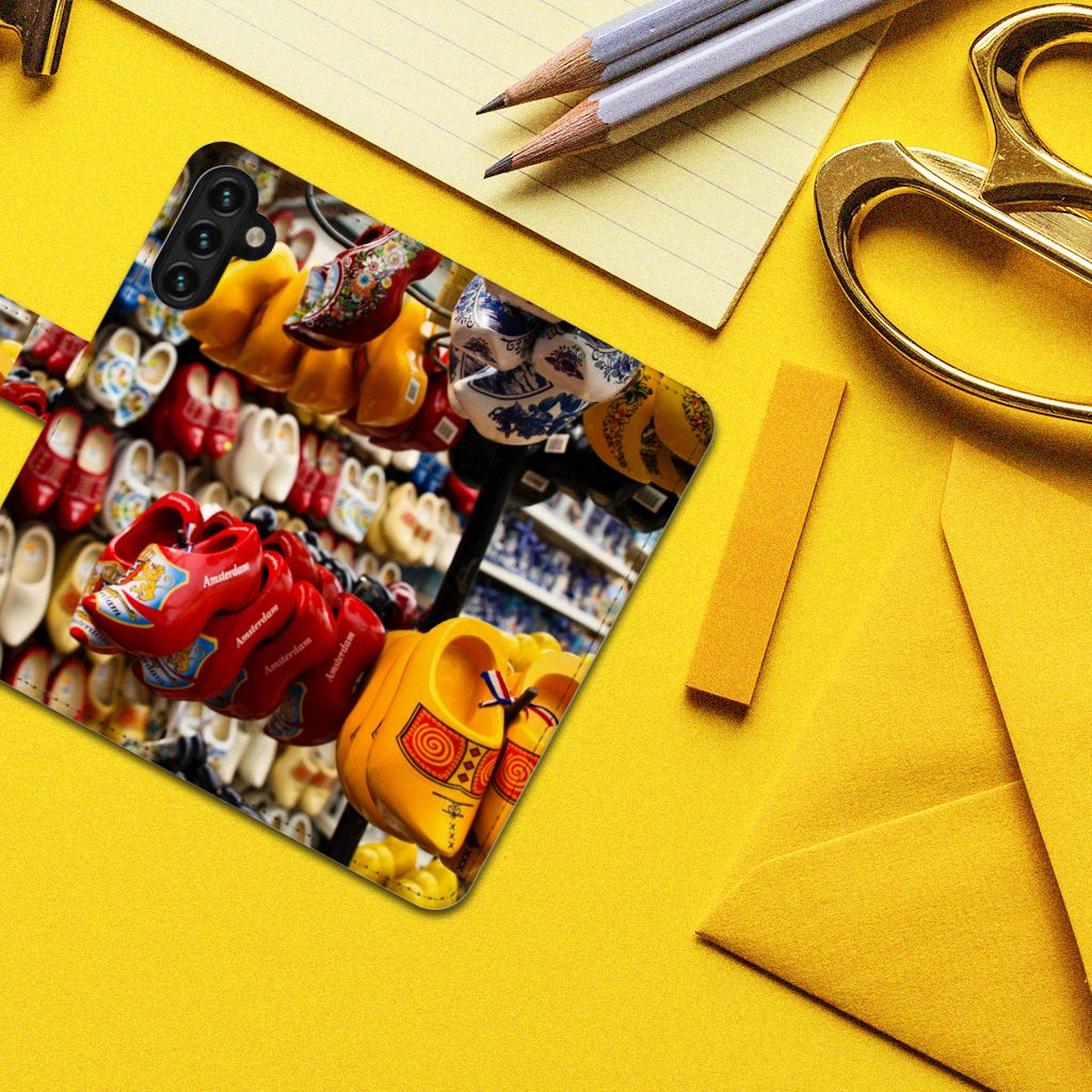 Een Samsung Galaxy A04s | Samsung Galaxy A13 5G Flip Cover met klompen is een schitterende versiering voor jouw smartphone. Traditioneel worden klompen in een gele kleur gemaakt, soms met eenvoudige versieringen die van plaats tot plaats verschillen. Dit mooie boekhoesje met verschillende soorten klompen in verschillende kleuren is zo’n beetje de veiligste case die er bestaat. Het hoesje met klompen zorgt voor een volledige bescherming van je smartphone en wordt aan alle zijden bedrukt. Sommige klompen staan ook op het lipje aan de buitenzijde. Verder is de houder aan de binnenzijde van TPU. Met een hoesje met klompen in verschillende kleuren op alle zijden blijft jouw telefoon volledig in tact. Sta je liever zelf met je eigen mooie klompen op een hoesje? Ontwerp dan zelf een bookstyle case met je eigen foto’s en teksten! Behalve klompen kun je zelfs je gehele boerderij op het boekhoesje zetten