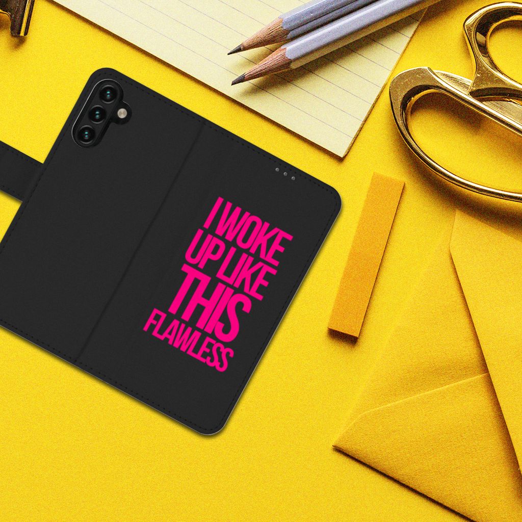 Met dit zwarte Samsung Galaxy A04s | Samsung Galaxy A13 5G Hoesje met naam met paarse tekst heb je een geweldige bescherming van je smartphone in handen. Dit zwarte hoesje met Woke Up tekst is een must voor jouw smartphone. Met dit design hoesje tekst val je ook zeker op. Je weet ook zeker dat het hoesje exclusief is. Het design is gemaakt door B2C Telecom. Het hoesje heeft verschillende vakjes en is aan alle zijden bedrukt. Ook het lipje aan de buitenkant kan worden bedrukt. De houder is van TPU, de buitenzijde van PU-leer. We willen je er ook op wijzen dat je zelf een hoesje kunt ontwerpen, met eigen beelden en teksten. Met onze Phone Case Designer kun je zelfs opvallende effecten, patronen en clip arts aan het ontwerp toevoegen.