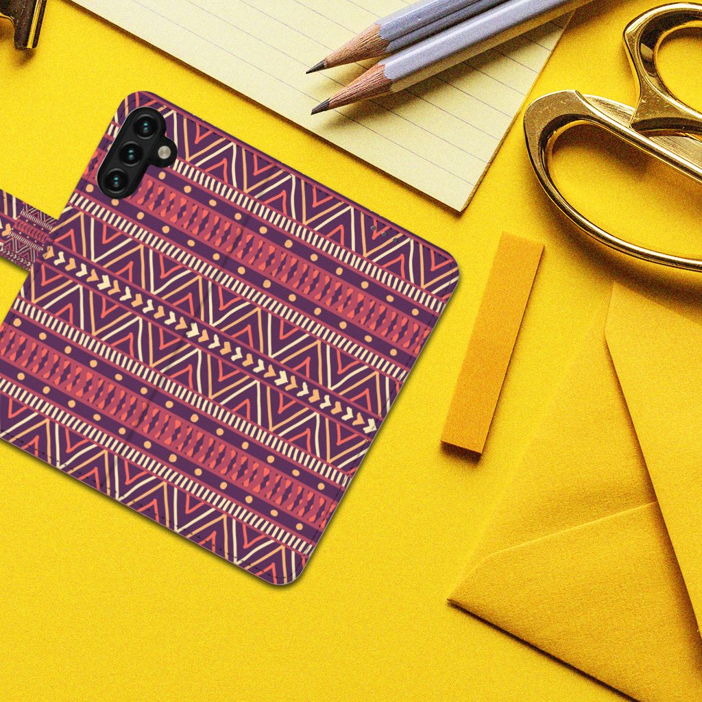 De Azteken leefden tussen 1200 en 1521 in het huidige Mexico. De mooie Aztec-patronen waar zij bekend om stonden, zien we nu nog op kleding, stoffen en tassen. Wie had toen kunnen bedenken dat we diezelfde prints honderden jaren later zelfs op een telefoonhoesje zouden vinden? Dit Aztec Purple-hoesje is perfect voor iedereen die een stukje geschiedenis bij zich wil dragen maar ook gewoon een mooi patroon op zijn hoesje wil. Dit vrolijke, kleurrijke ontwerp staat op een Telefoon Hoesje voor de Samsung Galaxy A04s | Samsung Galaxy A13 5G. Zo heb je naast een beschermde telefoon ook plek voor twee (bank)pasjes, geld en heb je meteen je belangrijkste bezittingen bij de hand. De houder is gemaakt van TPU, de buitenzijde van PU-leer.