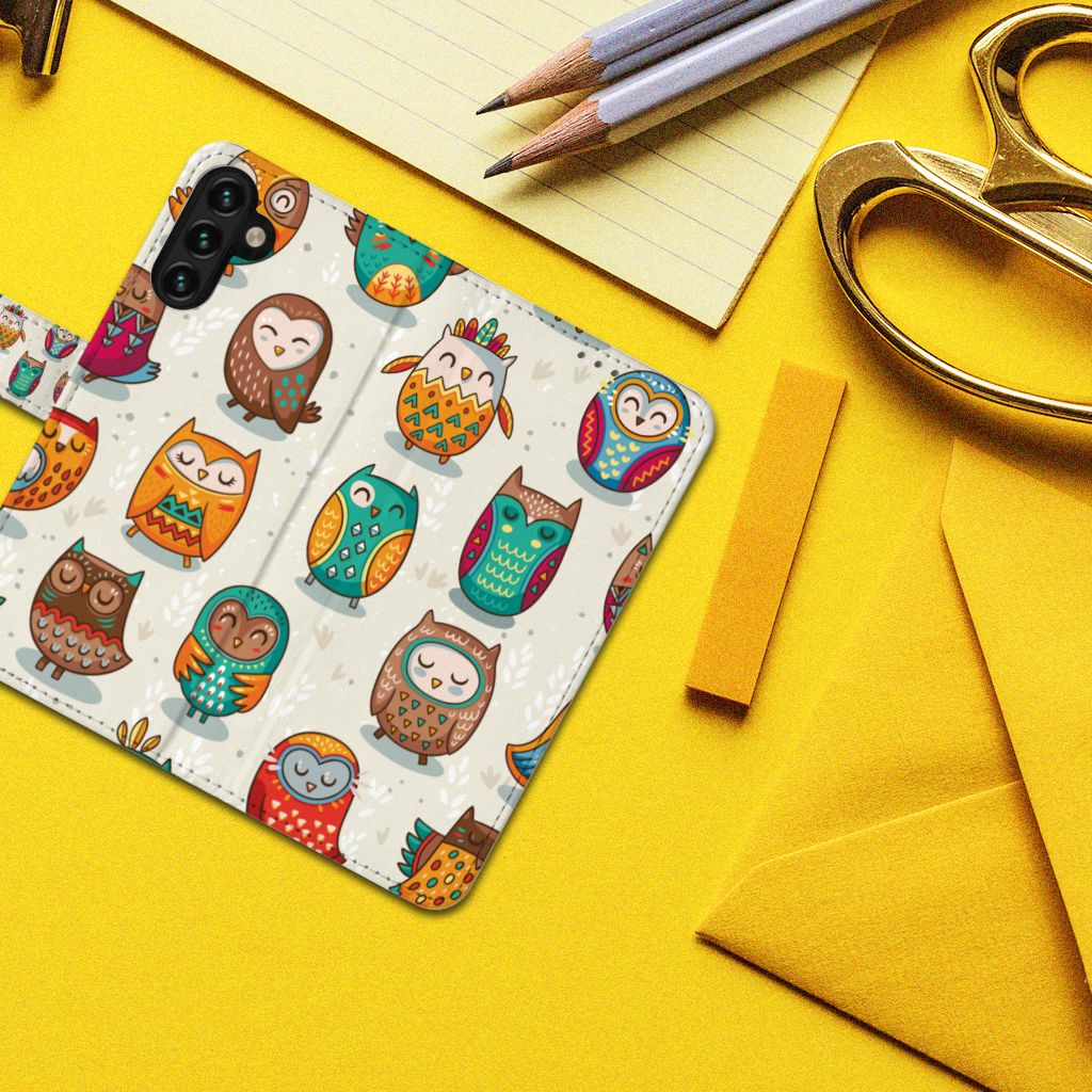 Samsung Galaxy A04s | Samsung Galaxy A13 5G Telefoonhoesje met ruimte voor drie pasjes Vrolijke Uilen