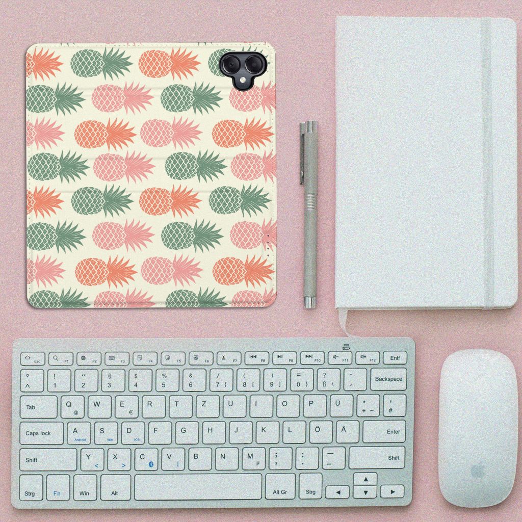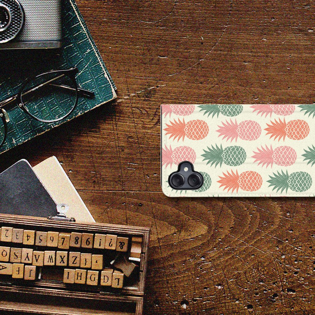 Ananas is een woord uit het Tupi, de taal van de Tupi-indianen, en betekent uitmuntende vrucht. Dit fruit van zeer hoge kwaliteit staat op onze superieure boekhoesjes, stand cases, hard cases en TPU cases. Jij blijft er gezond uitzien als je zo nu en dan een hap neemt van een Ananas , jouw smartphone blijft tip top in orde als je er een leuk telefoonhoesje omheen doet. Een ananas heeft stevig, veerkrachtig vruchtvlees. Een beetje te vergelijken met het TPU in onze hoesjes. TPU is elastisch materiaal, dat zeer buigzaam is. Vandaar dat het zeer schokbestendig is. Het ananas design staat op een stand case. Deze Samsung Galaxy A05 Flip Style Cover beschermt jouw telefoon aan alle kanten en beschikt over een 1 opbergvakje en een speciale standaard. Het hoesje wordt afgesloten met een magneet aan de binnenzijde. De houder aan de binnenzijde is van TPU.