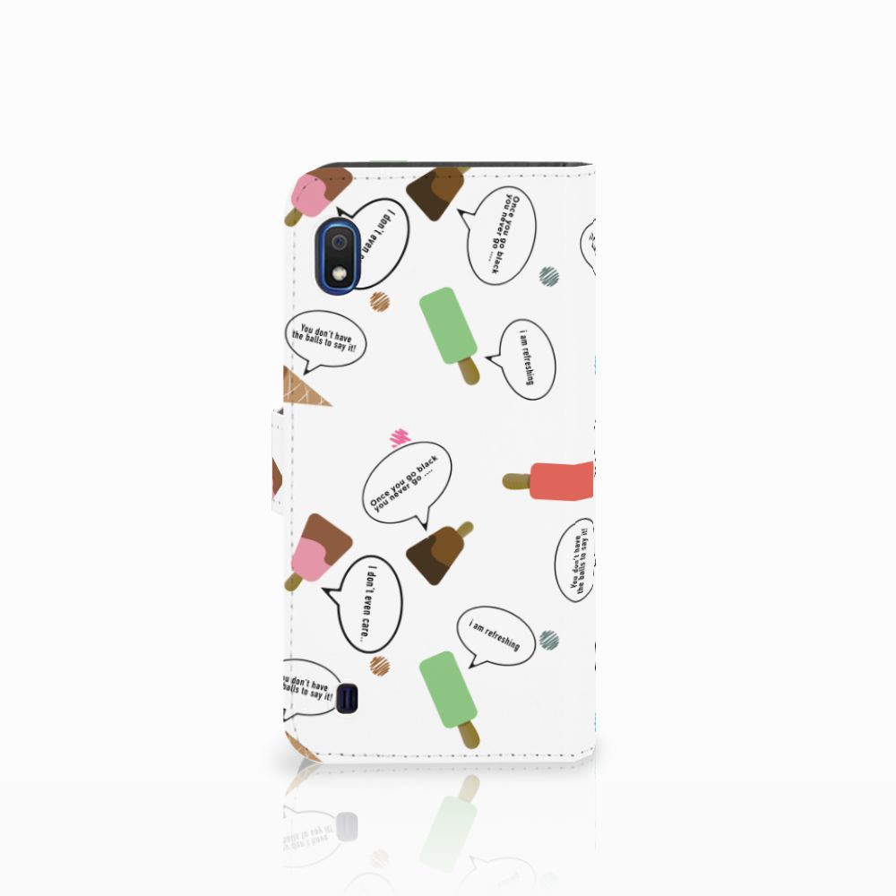 Van dit vrolijke Samsung Galaxy A10 Book Cover met daarop verschillende soorten ijsjes met tekstwolkjes krijg je sowieso een vrij en zomers gevoel. De zomer komt naar je toe met deze print van ijsjes met tekstwolkjes. Ben je op het strand, dan ontbreekt een lekker ijsje natuurlijk niet. Net zoals je je smartphone bij de hand hebt, met daaromheen een design hoesje met bijzondere ijsjes en tekstwolkjes. Jouw telefoon kan dan de bescherming in de vorm van een boekhoesje met ijsjes zeer goed gebruiken. Alle zijden van dit hoesje worden bedrukt met ijsjes en tekstwolkjes. De case heeft een lipje aan de buitenzijde voor het afsluiten van de telefoon en de houder aan de binnenzijde is van TPU. Onder alle weersomstandigheden zal deze case met verschillende opbergvakjes perfect functioneren, ook op het strand met een ijsje in je hand.
