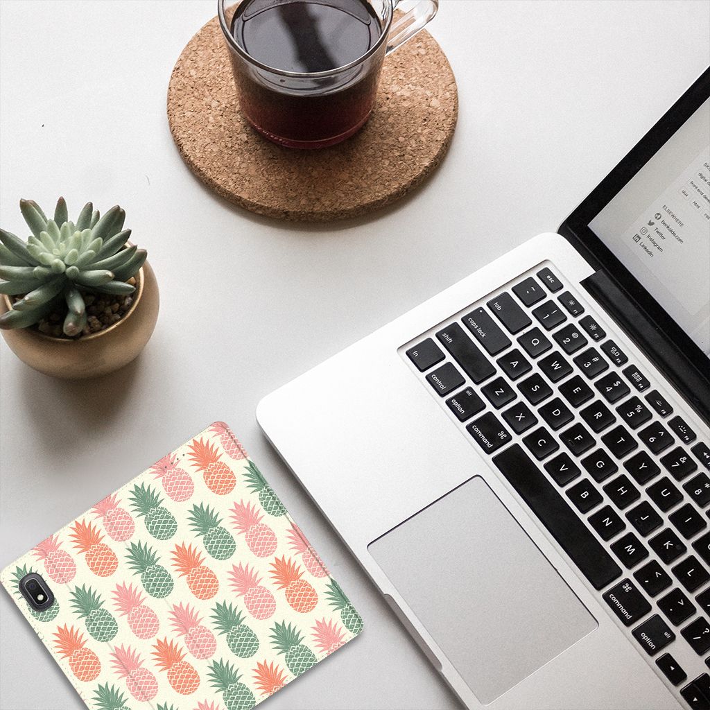 Ananas is een woord uit het Tupi, de taal van de Tupi-indianen, en betekent uitmuntende vrucht. Dit fruit van zeer hoge kwaliteit staat op onze superieure boekhoesjes, stand cases, hard cases en TPU cases. Jij blijft er gezond uitzien als je zo nu en dan een hap neemt van een Ananas , jouw smartphone blijft tip top in orde als je er een leuk telefoonhoesje omheen doet. Een ananas heeft stevig, veerkrachtig vruchtvlees. Een beetje te vergelijken met het TPU in onze hoesjes. TPU is elastisch materiaal, dat zeer buigzaam is. Vandaar dat het zeer schokbestendig is. Het ananas design staat op een stand case. Deze Samsung Galaxy A10 Flip Style Cover beschermt jouw telefoon aan alle kanten en beschikt over een 1 opbergvakje en een speciale standaard. Het hoesje wordt afgesloten met een magneet aan de binnenzijde. De houder aan de binnenzijde is van TPU.