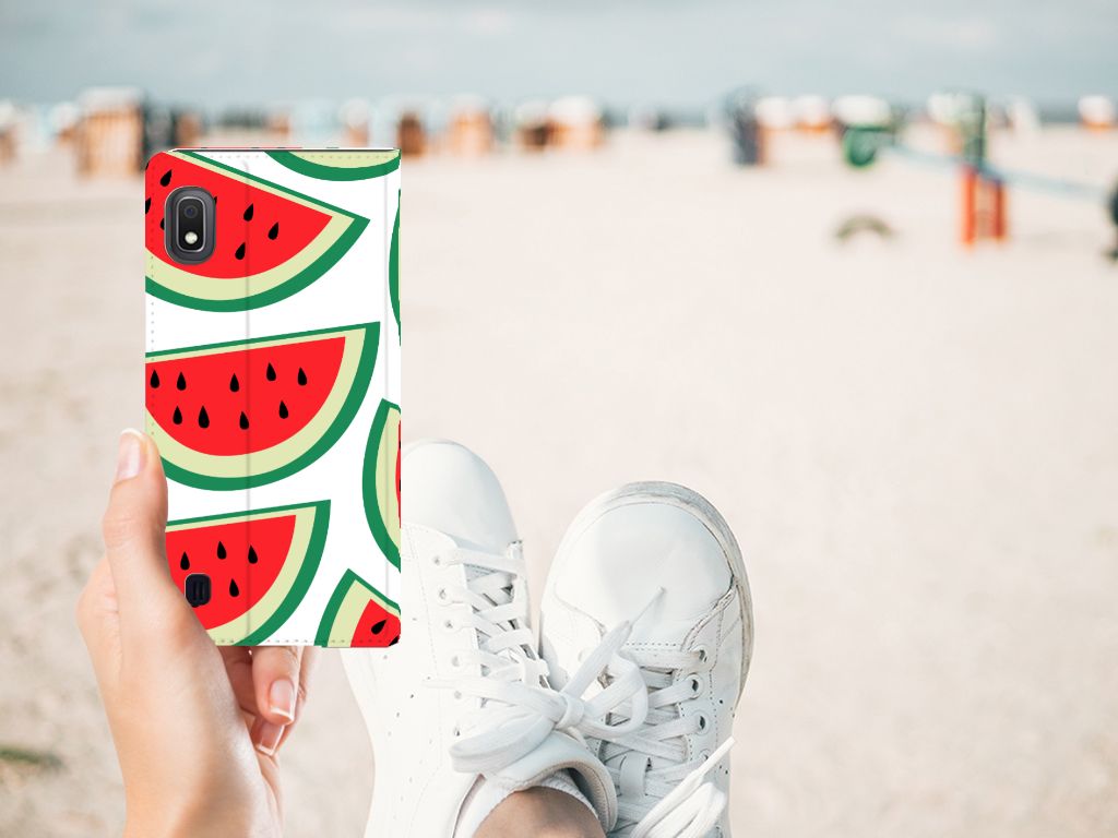 Watermeloenen zijn uitstekende dorstlessers, misschien dat je daarom juist in de zomermaanden extra enthousiast raakt van dit design hoesje Watermelons. Jij blijft gezond als je zo nu en dan een watermeloen neemt, jouw smartphone blijft in tact als je er deze Samsung Galaxy A10 Flip Style Cover omheen doet. De stand case beschermt jouw telefoon aan alle kanten en beschikt over een 1 opbergvakje en een speciale standaard. Het hoesje wordt afgesloten met een magneet aan de binnenzijde. De houder aan de binnenzijde is van TPU. Je kunt ook kiezen voor andere soorten fruit op je hoesje. Kijk maar eens naar onze andere design hoesjes op onze website.