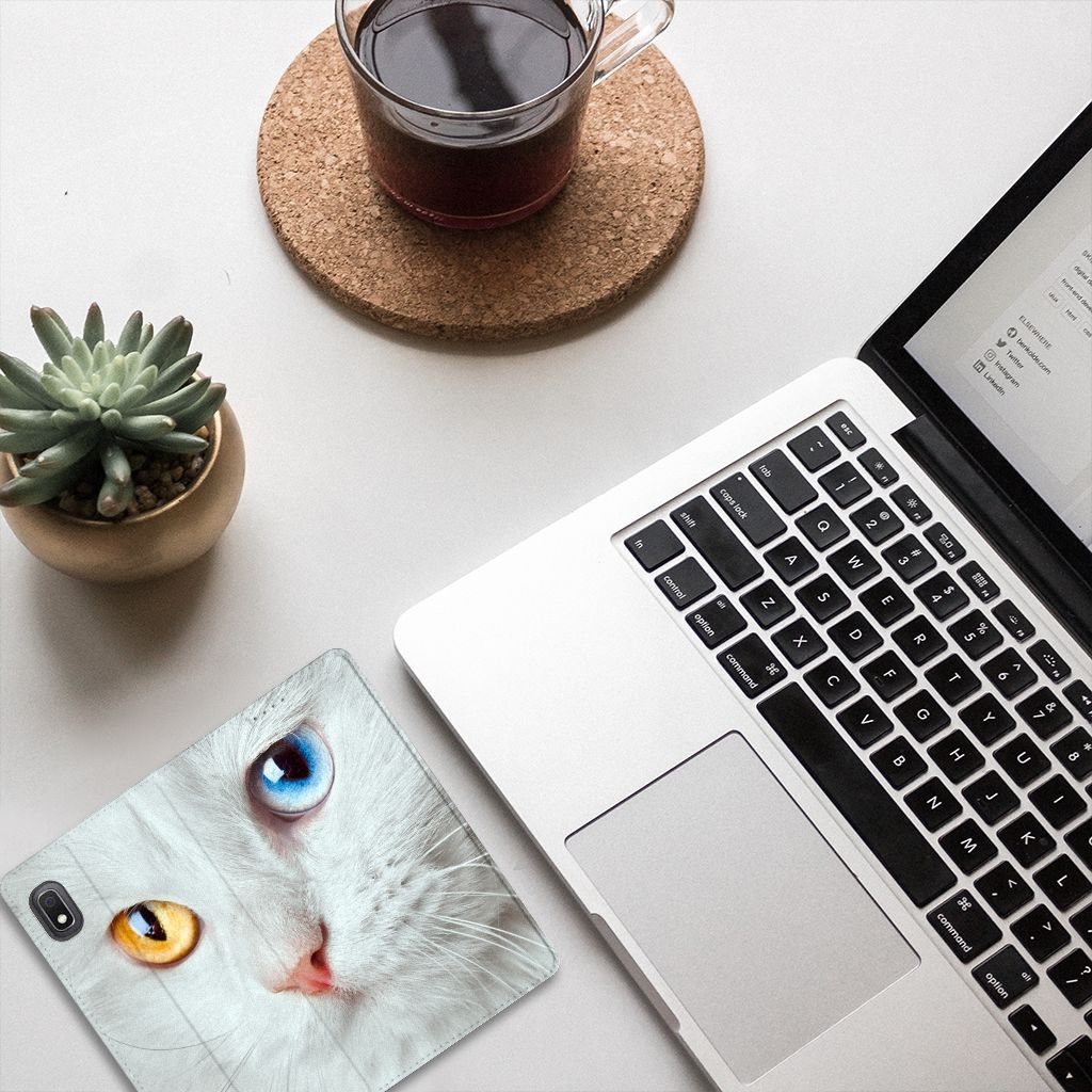Witte katten zijn natuurlijk extra speciaal, vandaar we een exemplaar op een design hoesje hebben gezet. Een witte kat schijnt trouwens ook slechter te kunnen horen dan katten met een andere kleur. Deze witte kat staat op een zeer prominente wijze op een stand case. Deze stand case met witte kat ziet er geweldig uit en is voorzien van verschillende uitsparingen en een speciale standaard. Een Samsung Galaxy A10 Hoesje maken met witte kat beschermt jouw smartphone perfect. Alle zijden van de case zijn bedrukt. Jouw smartphone wordt erg duurzaam met dit design hoesje. Het TPU aan de binnenzijde is zeer flexibel en het pu-leer oogt chique. Verder heeft de case een houder voor bijvoorbeeld je rijbewijs aan de binnenkant.