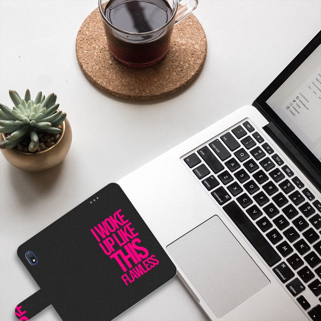 Met dit zwarte Samsung Galaxy A10 Hoesje met naam met paarse tekst heb je een geweldige bescherming van je smartphone in handen. Dit zwarte hoesje met Woke Up tekst is een must voor jouw smartphone. Met dit design hoesje tekst val je ook zeker op. Je weet ook zeker dat het hoesje exclusief is. Het design is gemaakt door B2C Telecom. Het hoesje heeft verschillende vakjes en is aan alle zijden bedrukt. Ook het lipje aan de buitenkant kan worden bedrukt. De houder is van TPU, de buitenzijde van PU-leer. We willen je er ook op wijzen dat je zelf een hoesje kunt ontwerpen, met eigen beelden en teksten. Met onze Phone Case Designer kun je zelfs opvallende effecten, patronen en clip arts aan het ontwerp toevoegen.