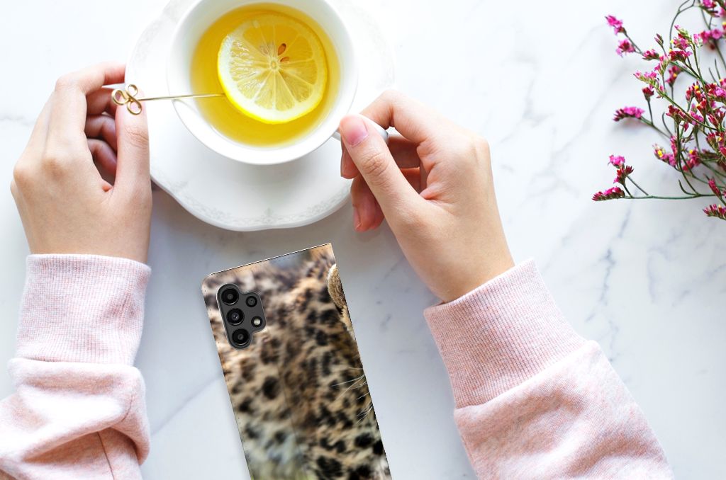 De luipaard is een grote, gespierde katachtige met korte, krachtige poten en een lange staart. Aangezien het op dit hoesje een baby luipaard betreft, zijn deze eigenschappen nog niet volledig tot wasdom gekomen. De kop van de luipaard is breed en een beetje rond van vorm met kleine, ronde oren. De snuit is middelgroot, met krachtige kaken en lange snorharen. De vacht van een luipaard is bedekt met veel zwarte vlekken. Kies je voor dit design hoesje, dan zal er van vlekken op jouw smartphone nooit en te nimmer sprake zijn. Het stoere en tegelijkertijd aandoenlijke design staat op een stand case. Een Samsung Galaxy A13 (4G) Hoesje maken beschermt jouw telefoon aan alle kanten en beschikt over een 1 opbergvakje en een speciale standaard. Het hoesje wordt afgesloten met een magneet aan de binnenzijde. De houder aan de binnenzijde is van TPU.