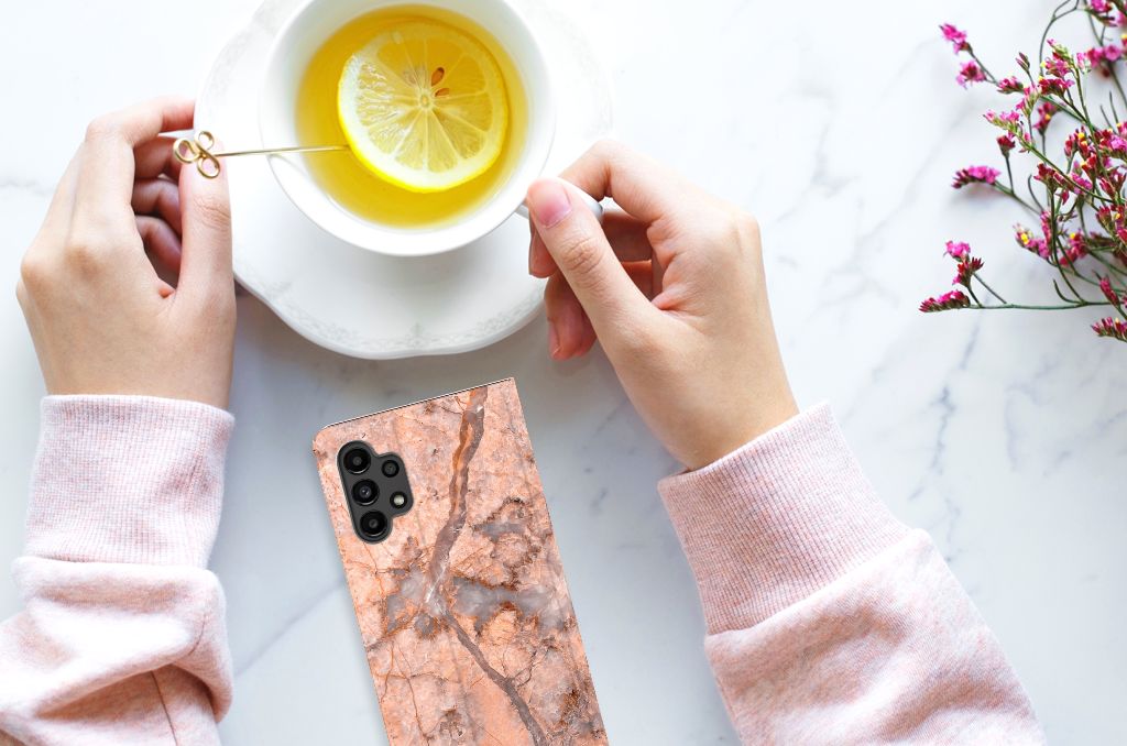 Dit design hoesje met Marmer Oranje is zeer geschikt voor jouw kostbare telefoon. Vanwege zijn prachtige lichtval en vastheid is marmer een zeer gewild bouwmateriaal. Wij kunnen inmiddels concluderen dat dit hoesje met oranje marmer ook zeer gewild is. Beloon jezelf en je telefoon met dit hele mooie Samsung Galaxy A13 (4G) Standcase. Naast het oranje marmer zijn er de diverse marmersoorten in een ruim kleurenpallet te krijgen. Deze stand case met marmer in oranje wordt bedrukt op alle zijden. De case beschikt over een vakje voor een pasje en toebehoren en een magnetische sluiting aan de binnenzijde. Verder heeft de case in oranje marmer een houder van TPU. Wij hebben onze designer veel vrijheid gegeven met het ontwerpen dit mooie hoesje. Het resultaat zie je terug in deze stand case met oranje marmer, dat de ideale bescherming is voor jouw smartphone. Des te mooi dat wij voor variatie hebben gekozen door een hoesje met oranje marmer aan de bieden.