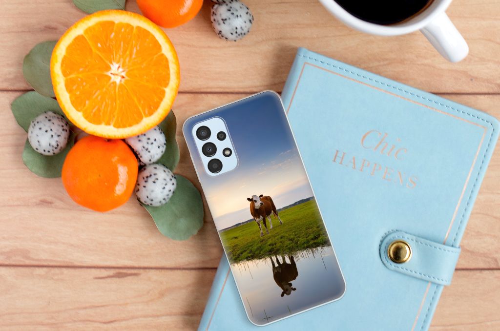 Het levert een idyllisch plaatje op, dit hoesje met een koe en ondergaande zon op de achtergrond. Door een koe buiten te laten lopen en grazen, hebben ze minder kans om ziek te worden. De Koe graast het liefst met soortgenoten, al zijn deze een stukje van de koe op de case verwijderd. Dit levert ook een mooi plaatje op, zoals je kunt zien op dit design hoesje. Dit tpu hoesje met koeien ziet er flexibel uit en is voorzien van alle uitsparingen. Een Samsung Galaxy A13 4G TPU Hoesje met koeien beschermt jouw smartphone vooral aan de achterkant en zijkanten. De zijkanten blijven transparant, de rest van het hoesje is bedrukt. Koeien herkauwen het liefst liggend, behalve wanneer het regent. Zo goed als grazen voelt voor koeien, zo duurzaam zal jouw smartphone blijven met dit design hoesje. Het TPU is schokabsorberend en niet te breken. De TPU case past altijd in je broekzak.