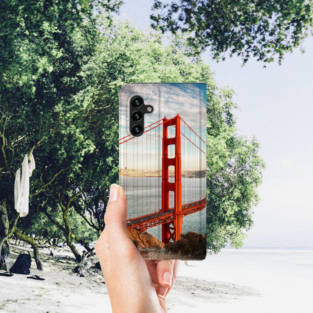 De Golden Gate Bridge is een technisch meesterwerk. Een van de langste en hoogste hangbruggen ter wereld is een schitterend staaltje van ingenieurskunst en een prachtig monument, dat met de rode kleur fel afsteekt tegen de omgeving. Dit monument komt op een fraaie manier tot uitdrukking op deze Samsung Galaxy A13 (5G) | Samsung Galaxy A04s Book Cover. Het telefoonhoesje met design heeft 1 opbergvakje, waarin je een pasje of briefgeld kunt stoppen. Jouw telefoon past precies in de houder van TPU en de case wordt aan de binnenzijde magnetisch afgesloten. De Golden Gate Bridge is vanuit vele plekken in en rond San Francisco op een spectaculaire manier zichtbaar. Alle kanten van het telefoonhoesje worden bedrukt met foto’s van dit monument. Jouw telefoon is aan alle kanten goed beschermd met dit design hoesje met Golden Bridge print.