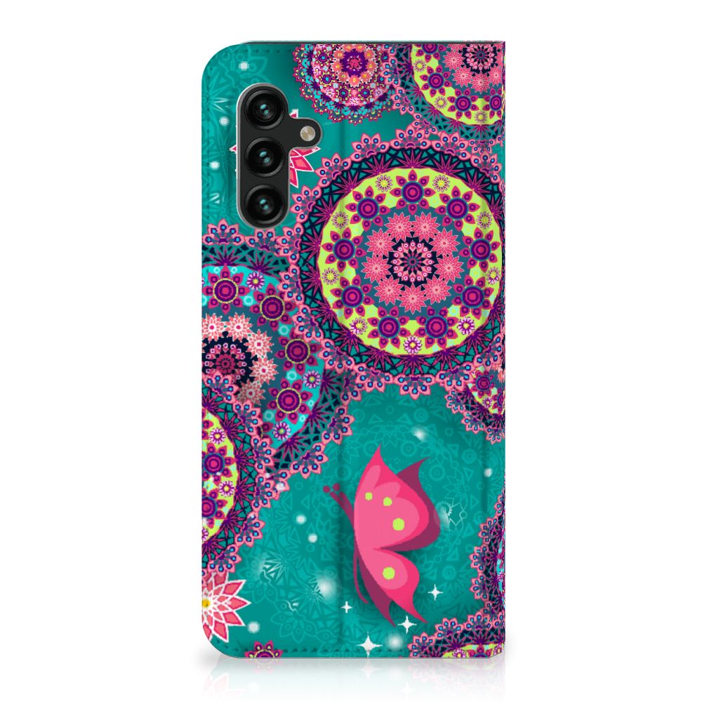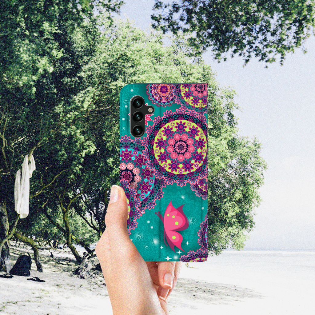 Deze opvallende Samsung Galaxy A13 (5G) | Samsung Galaxy A04s Bookcase met Cirkels en Vlinders is een ware eyecatcher. De meeste vlinders hebben een onopvallende vleugelkleur en dat kun je van de soort op dit hoesje ook zeker wel zeggen. Wij kunnen deze opvallende vlinders en cirkels op een zeer handige stand case zetten. Deze hoesjes zijn zeer gewild. Met onze geavanceerde printer zetten we de print van opvallende vlinders en cirkels op alle zijden van het hoesje. De case met vlinders heeft aan de binnenkant een houder waarin je jouw creditcard of ander pasje kwijt kunt. De case heeft bovendien een handige standaard. Verder is je telefoon natuurlijk maximaal beschermd met deze stand case met print van opvallende en kleurrijke vlinders. De houder aan de binnenzijde van het design hoesje met opvallende vlinder print is van TPU.