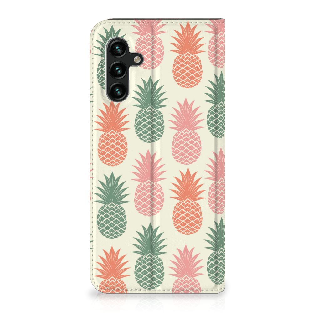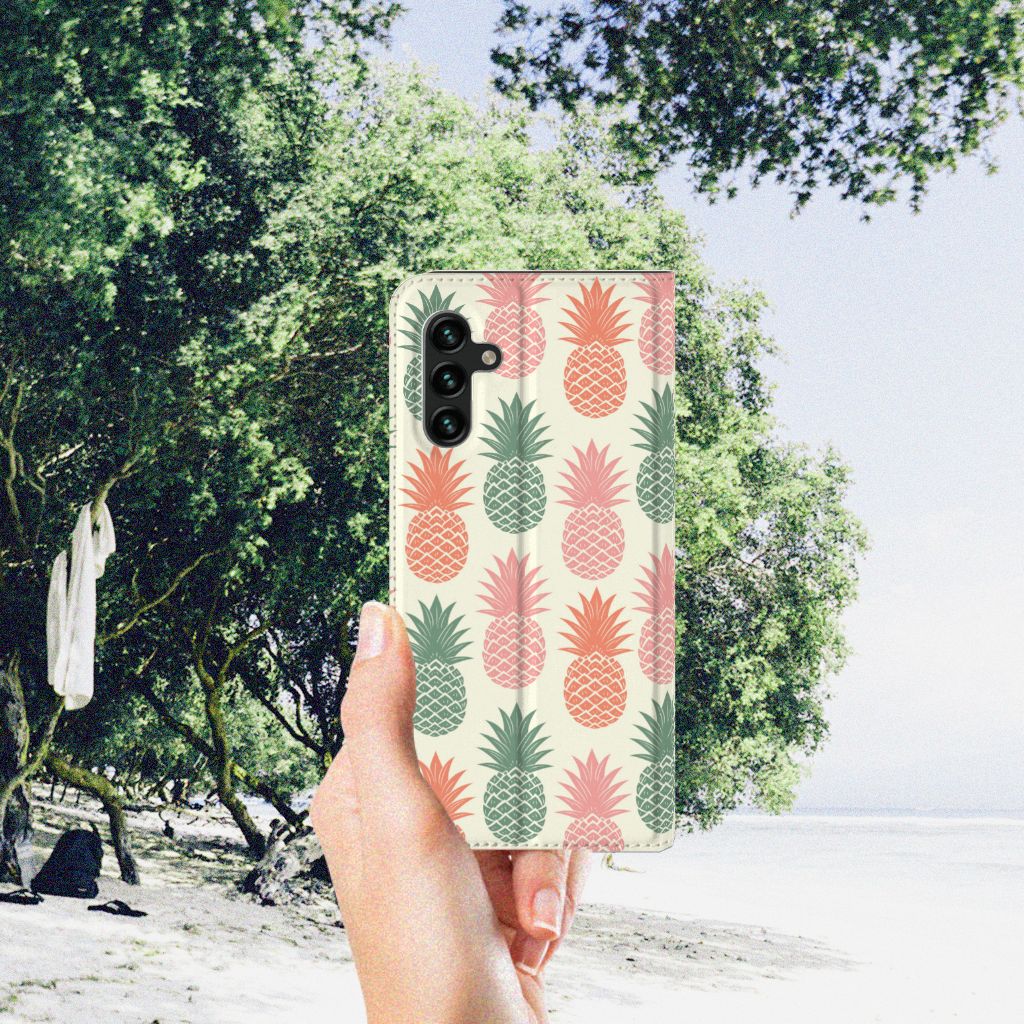 Ananas is een woord uit het Tupi, de taal van de Tupi-indianen, en betekent uitmuntende vrucht. Dit fruit van zeer hoge kwaliteit staat op onze superieure boekhoesjes, stand cases, hard cases en TPU cases. Jij blijft er gezond uitzien als je zo nu en dan een hap neemt van een Ananas , jouw smartphone blijft tip top in orde als je er een leuk telefoonhoesje omheen doet. Een ananas heeft stevig, veerkrachtig vruchtvlees. Een beetje te vergelijken met het TPU in onze hoesjes. TPU is elastisch materiaal, dat zeer buigzaam is. Vandaar dat het zeer schokbestendig is. Het ananas design staat op een stand case. Deze Samsung Galaxy A13 (5G) | Samsung Galaxy A04s Flip Style Cover beschermt jouw telefoon aan alle kanten en beschikt over een 1 opbergvakje en een speciale standaard. Het hoesje wordt afgesloten met een magneet aan de binnenzijde. De houder aan de binnenzijde is van TPU.