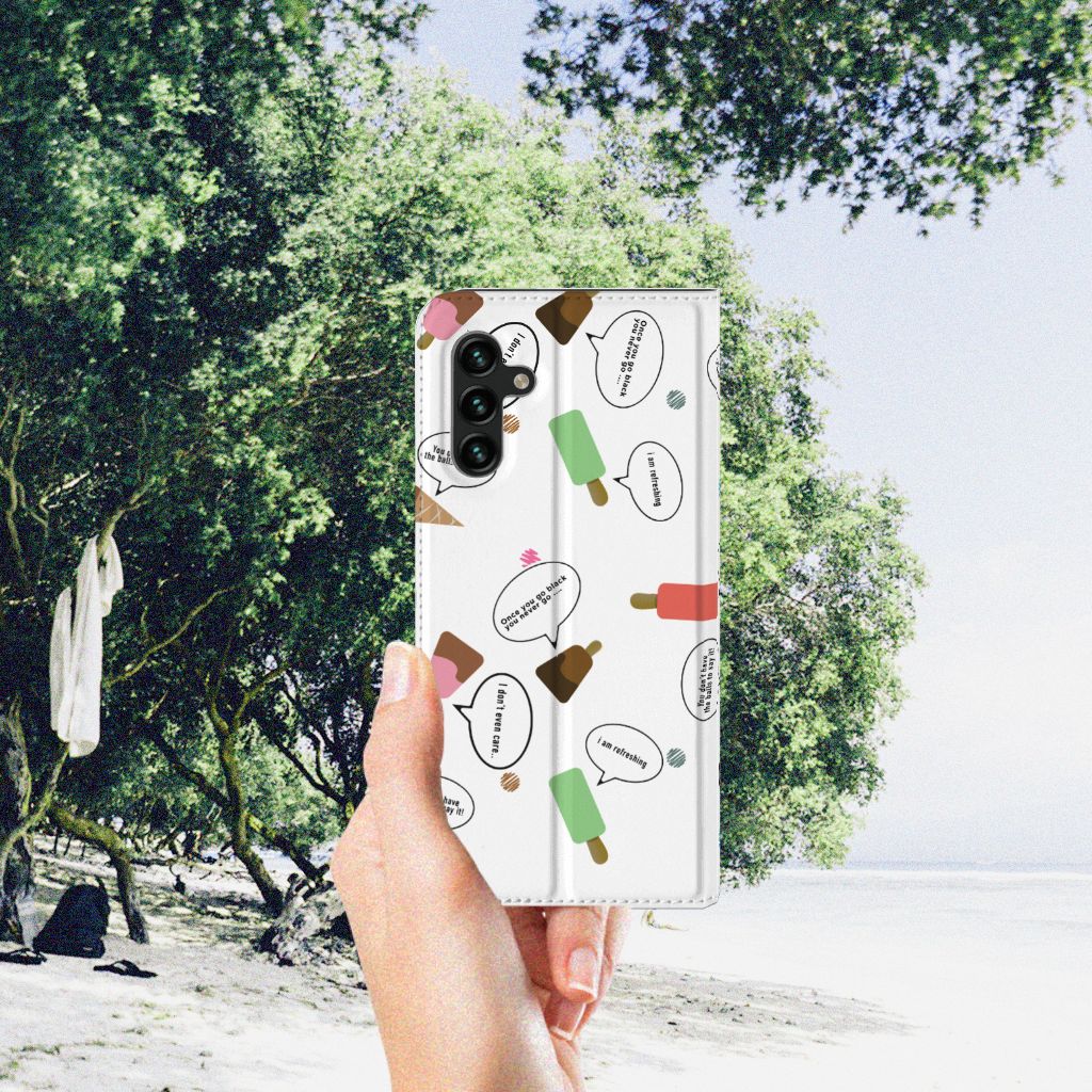 Van deze vrolijke Samsung Galaxy A13 (5G) | Samsung Galaxy A04s Flip Style Cover met daarop verschillende soorten ijsjes met tekstwolkjes krijg je sowieso een vrij en zomers gevoel. De zomer komt naar je toe met deze print van ijsjes met tekstwolkjes. Ben je op het strand, dan ontbreekt een lekker ijsje natuurlijk niet. Net zoals je je smartphone bij de hand hebt, met daaromheen een design hoesje met bijzondere ijsjes en tekstwolkjes. Jouw telefoon kan dan de bescherming in de vorm van een stand case met ijsjes zeer goed gebruiken. Alle zijden van dit hoesje worden bedrukt met ijsjes en dankzij de speciale standaard is het erg prettig om filmpjes te bekijken. De case wordt aan de binnenzijde met een magneet afgesloten en de houder aan de binnenzijde is van TPU. Onder alle weersomstandigheden zal deze case met 1 opbergvakje en ijsjes perfect functioneren, ook op het strand met een ijsje in je hand.