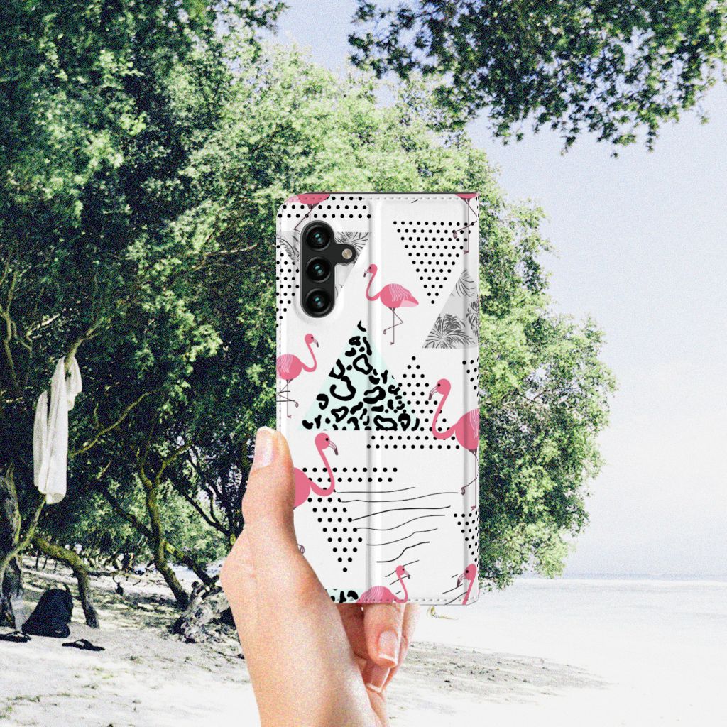 Een Samsung Galaxy A13 (5G) | Samsung Galaxy A04s Hoesje maken met Flamingo Triangle is in vele opzichten bijzonder. De rode flamingo op het hoesje komt oorspronkelijk uit het Caraïbische gebied. Stel dat je in deze regio vakantie viert, dan val je zonder meer op met dit hoesje met flamingo’s en driehoeken. Deze stand case biedt bescherming voor alle zijden van je telefoon. Jouw smartphone ligt goed opgeborgen in de TPU houder aan de binnenzijde en in dit gedeelte van het hoesje met flamingo’s en driehoeken zit de magnetische sluiting. Ook de palmbomen op deze stand case bieden het ultieme vakantiegevoel. De stand case met flamingo’s en driehoeken heeft vakjes voor pasjes en is op maat gemaakt.