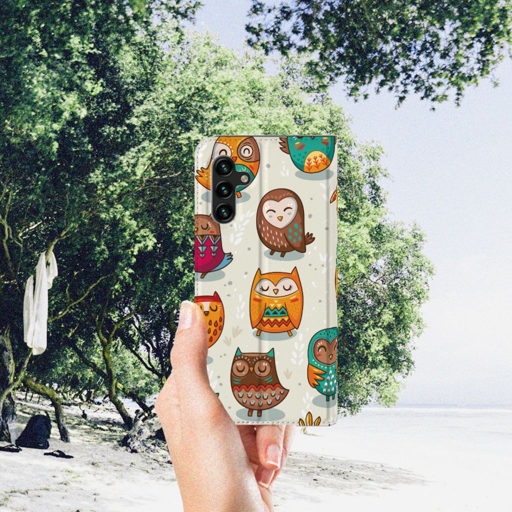 Deze Samsung Galaxy A13 (5G) | Samsung Galaxy A04s Hoesje maken met Vrolijke Uilen is echt iets voor de nachtbrakers onder ons. De uil is zoals je weet bij uitstek een vogel die in de nachtelijke uren actief is. Ben jij ook iemand die s ’nachts tot leven komt, dan is deze stand case met uilen in felle kleuren echt iets voor jou. Als je tot in de late uurtjes op stap bent, komt het goed uit dat jouw smartphone aan alle kanten goed is beschermd met deze stand case met uilen. De case met uilen heeft een magnetische sluiting aan de binnenkant, waardoor de hoes niet openklapt als die uit je handen valt. Jouw creditcard of pinpas heb je als het goed is veilig opgeborgen in het vakje aan de binnenzijde. De houder aan de binnenzijde van de case met print van uilen is van het flexibele TPU. De wat ruigere types hebben veel baat bij deze stand case met uilen in felle kleuren.