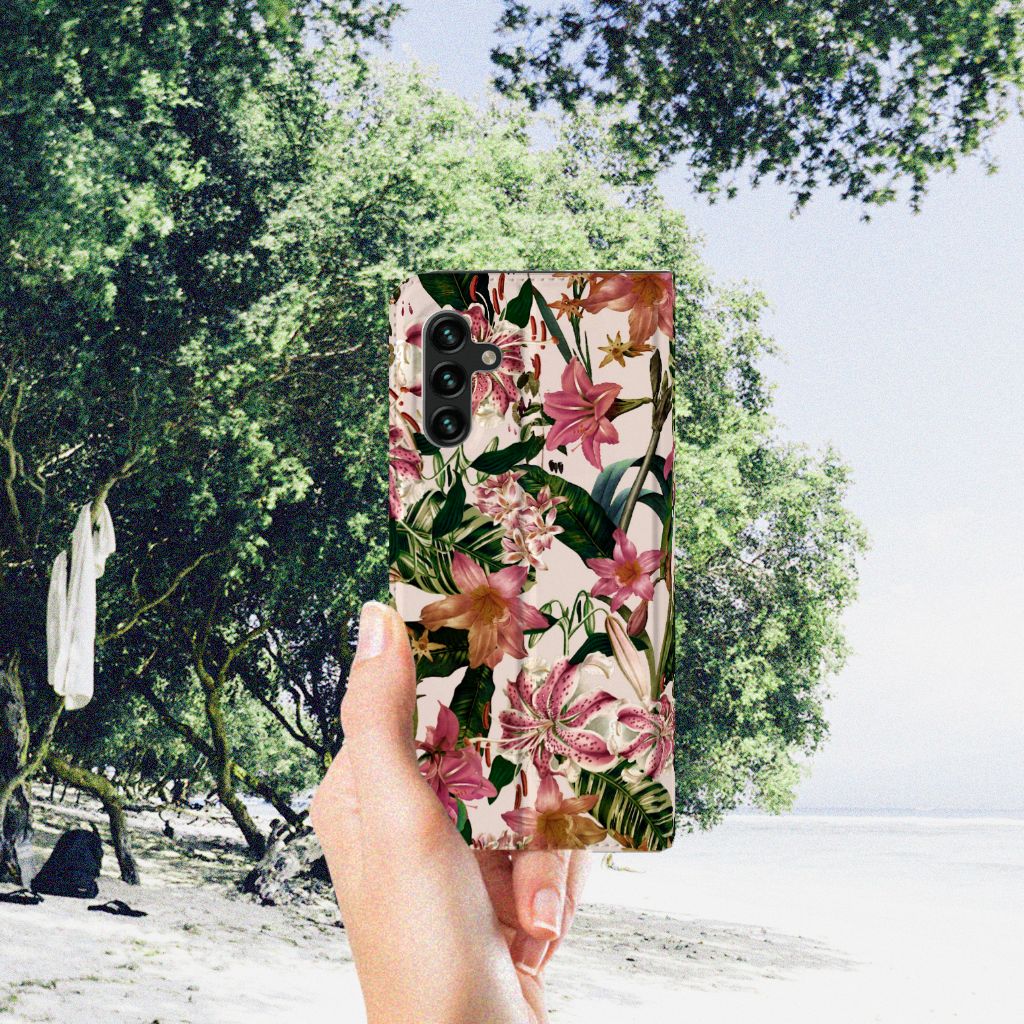 Dit Flowers design is een zegen voor de mens en zijn smartphone. De paarswitte bloemen en groene bladeren op deze Samsung Galaxy A13 (5G) | Samsung Galaxy A04s Smart Cover geven jouw smartphone een zeer sierlijke uitstraling. Je krijgt er meteen een goed gevoel bij als je aan het appen, mailen of aan het bellen bent. Valt dan je telefoon op de grond, dan zal er dankzij de stand case met paarswitte bloemen en groene bladeren geen schade ontstaan. Onze stand cases met paarswitte bloemen en groene bladeren bieden de allerbeste bescherming en zijn heel praktisch, wat blijkt uit onder meer het vakje aan de binnenkant en de handige standaard waarmee je de smartphone rechtop op tafel neer kunt zetten. De paarswitte bloemen en groene bladeren komen op alle zijden van de case te staan. Op deze stand case van leer en TPU (houder aan de binnenkant) kun je in no time zelf foto’s van jouw favoriete bloemen zetten.