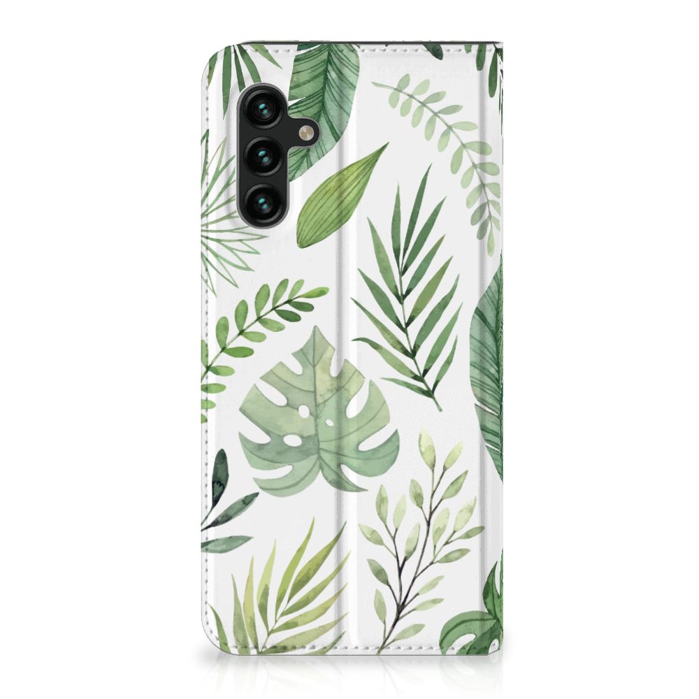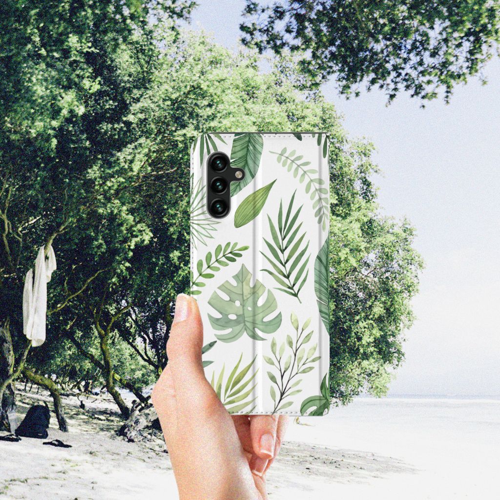 Je voelt je verbonden met de natuur als je kiest voor deze Samsung Galaxy A13 (5G) | Samsung Galaxy A04s Smart Cover met print Leaves. De print bestaat uit verschillende groene bladeren en dit zorgt voor een fraai decoratief geheel. Met dit patroon van groene bladeren creëer je een frisse uitstraling voor jouw smartphone. Jij doet er verstandig aan om je telefoon te beschermen met dit design hoesje met groene bladeren, die staan op een stand case. Dit hoesje kenmerkt zich onder meer door het handige vakje aan de binnenzijde en de magnetische sluiting aan de binnenzijde. Voel jij jezelf gezond met een beeld van groene bladeren, dan is deze stand case met print een uitstekende optie. Het beschermt jouw telefoon aan alle zijden. Het TPU aan de binnenzijde klemt zich perfect om jouw smartphone. Kijk ook eens naar onze andere hoesjes met bladeren of misschien maak je zelf wel gewoon liefst je eigen hoesje met eigen foto’s van bladeren.