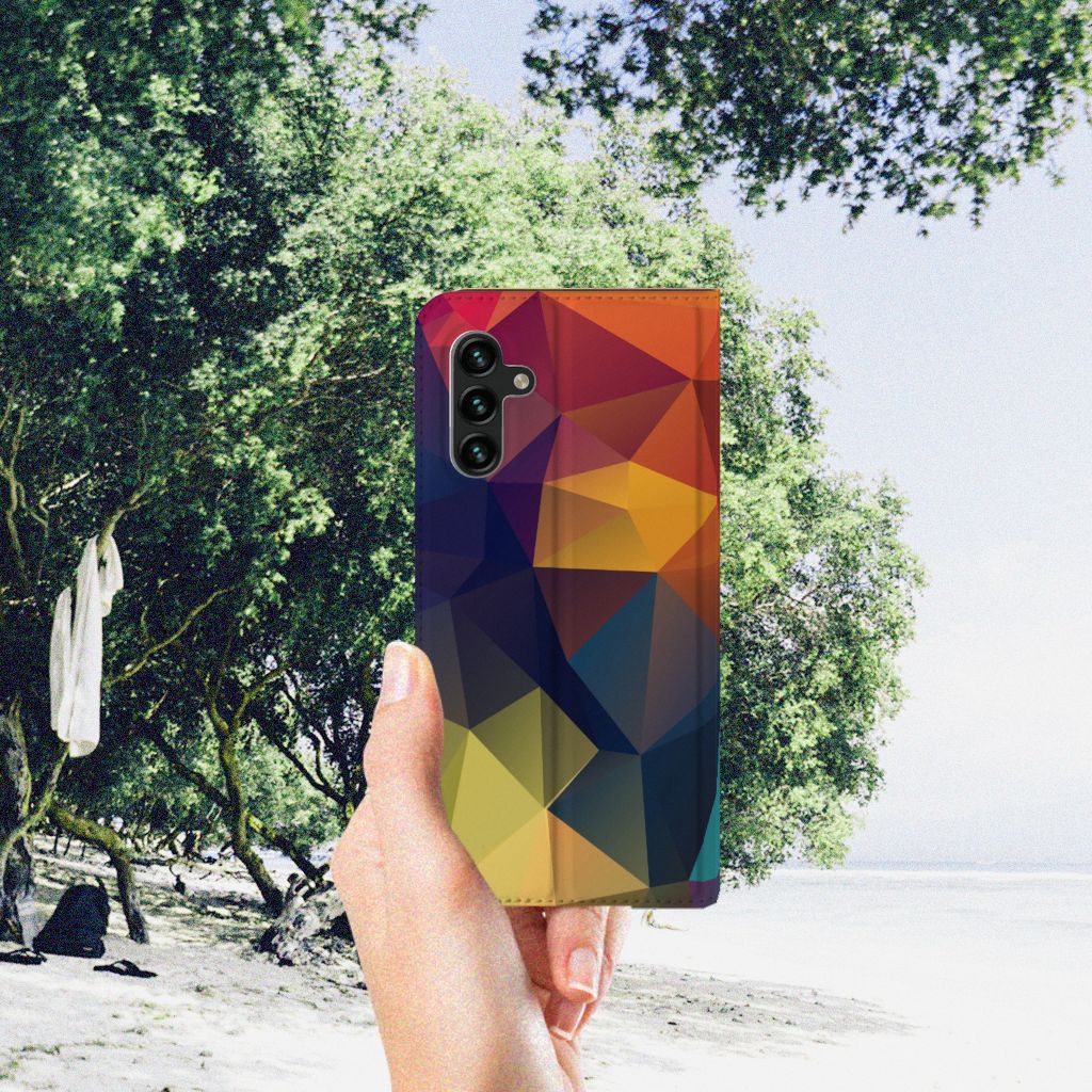 Veelkleurige driehoeken die samen eindeloze asymmetrische patronen lijken te vormen. Het is het abstracte schouwspel dat op dit fraaie hoesje voor je Samsung Galaxy A13 (5G) | Samsung Galaxy A04s direct de aandacht trekt noemen we voor het gemak trekt noemen we voor het gemak Polygon Color. De een ziet er een berglandschap in, de ander piramides. Wat zie jij erin? Zeker is in elk geval dat de aanblik van dit fascinerende ontwerp je niet snel gaat vervelen. Het kleurige spel van lijnen en vlakken blijft eindeloos boeien en geeft jouw Stand Case een hippe en kunstzinnige uitstraling. De kracht die het lijnenspel uitstraalt, komt ook terug in het hoesje zelf. De solide hoes van PU-leer beschikt ook over een 1 pashouder en een speciale standaard. Het hoesje wordt afgesloten met een magneet aan de binnenzijde. De houder aan de binnenzijde is van TPU. Alle zijden worden bedrukt.