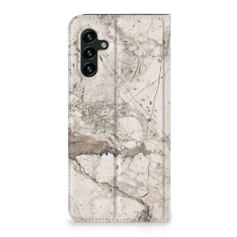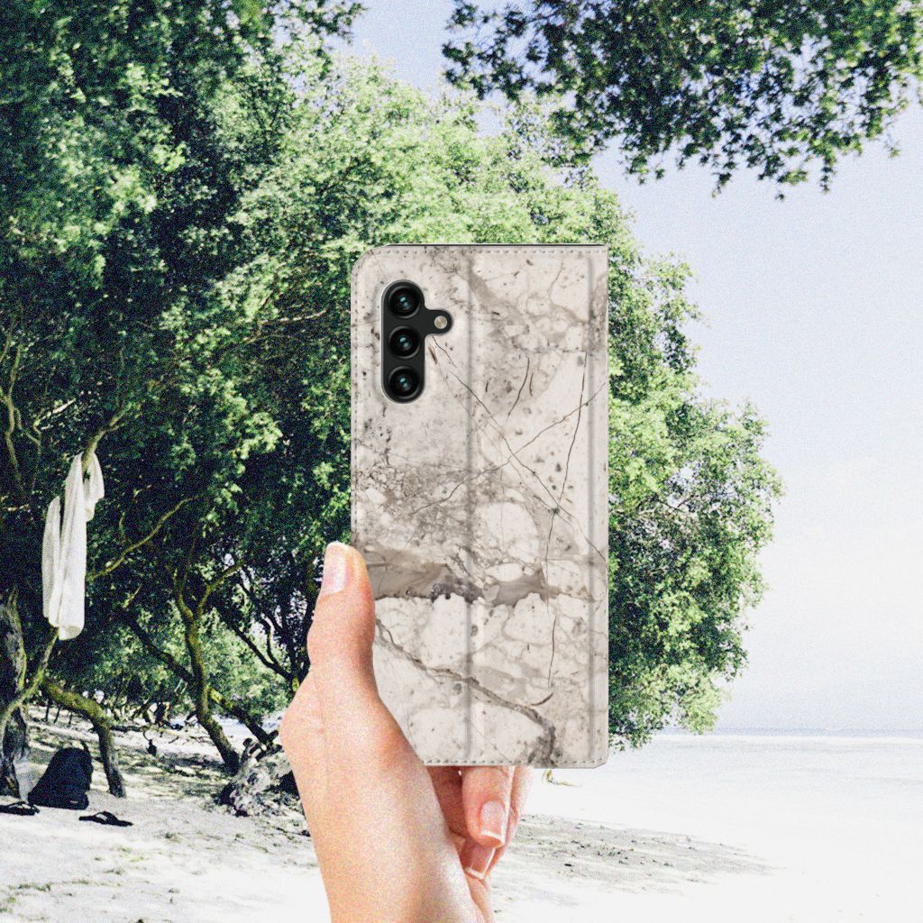 Dit design hoesje met Marmer Beige is voor de artistieke personen onder ons. De Grieken en Romeinen wisten het steen al te waarderen door het als bouw- en bekledingsmateriaal toe te passen. Naast het witte Carrara marmer met haar zacht grijze geaderde belijning zijn de diverse marmersoorten in een ruim kleurenpallet te krijgen. We hebben verschillende kleuren op design hoesjes gezet, zoals in dit geval beige marmer. Dit is een Samsung Galaxy A13 (5G) | Samsung Galaxy A04s Standcase met marmer in beige kleur. Het marmer wordt bedrukt op alle zijden van een stand case, die beschikt over 1 vakje voor een pasje en toebehoren en een magnetische sluiting aan de binnenkant. Verder heeft de case een houder van TPU. De rijkheid aan kleuren en varianties in afwerking geeft designers de vrijheid om met marmer hele mooie architectonische projecten te realiseren. Wij hebben onze designer ook veel vrijheid gegeven. Het resultaat zie je terug in deze stand case met beige marmer, dat de ideale bescherming voor jouw smartphone biedt.