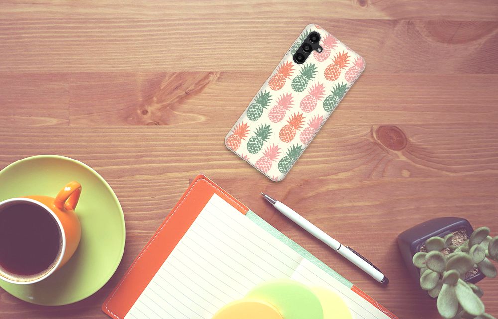 Ananas is een woord uit het Tupi, de taal van de Tupi-indianen, en betekent uitmuntende vrucht. Dit fruit van zeer hoge kwaliteit staat op onze superieure boekhoesjes, stand cases, hard cases en TPU cases. Jij blijft er gezond uitzien als je zo nu en dan een hap neemt van een Ananas , jouw smartphone blijft tip top in orde als je er een leuk telefoonhoesje omheen doet. Een ananas heeft stevig, veerkrachtig vruchtvlees. Een beetje te vergelijken met het TPU in onze hoesjes. TPU is elastisch materiaal, dat zeer buigzaam is. Vandaar dat het zeer schokbestendig is. Het ananas design staat op een staat op een TPU case. Deze Samsung Galaxy A13 | A04s Siliconen Case wordt alleen aan de bovenkant bedrukt en is zeer flexibel. De randen van het hoesje blijven transparant.