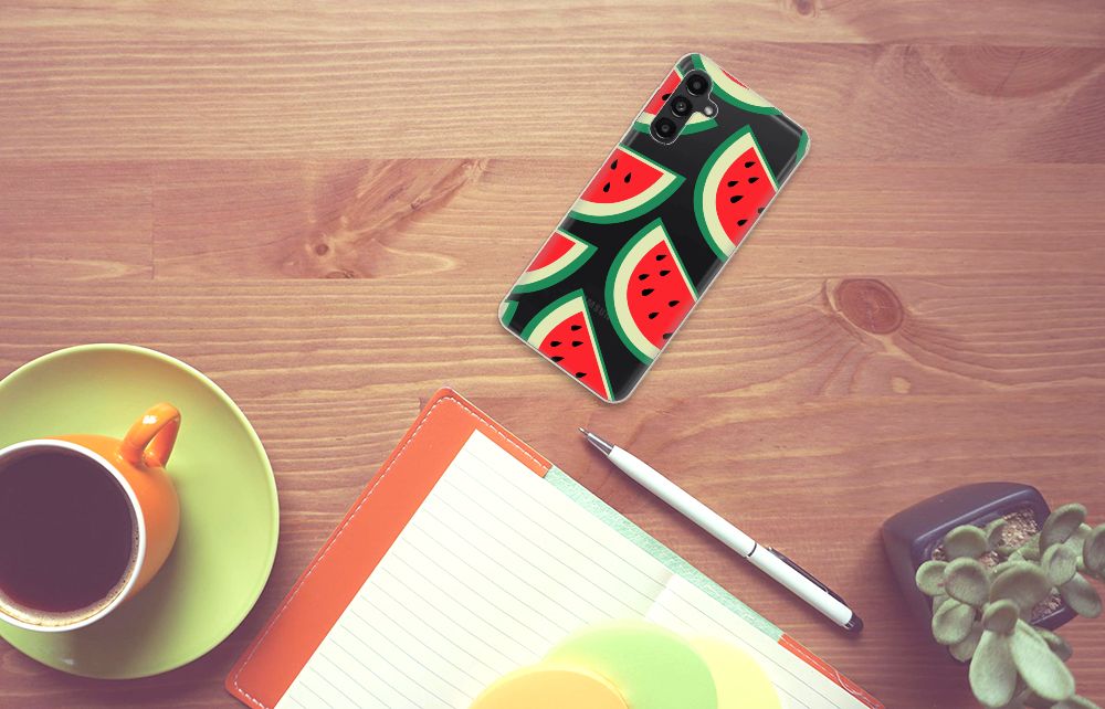 Watermeloenen zijn uitstekende dorstlessers, misschien dat je daarom juist in de zomermaanden extra enthousiast raakt van dit design hoesje Watermelons. Jij blijft gezond als je zo nu en dan een watermeloen neemt, jouw smartphone blijft in tact als je er deze Samsung Galaxy A13 | A04s Siliconen Case omheen doet. Deze tpu case wordt alleen aan de bovenkant bedrukt met watermeloenen is zeer flexibel. De randen van het hoesje blijven transparant. Je kunt ook kiezen voor andere soorten fruit op je hoesje. Kijk maar eens naar onze andere design hoesjes op onze website.