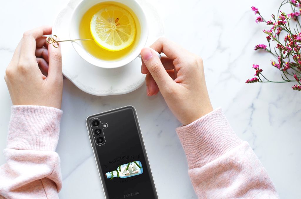 Dit leuke design met een schip in een fles is voor de echte avonturier of reiziger. Dankzij de tekst ‘Never stop exploring: Go for it’ word je altijd herinnerd aan het feit dat het volgende avontuur weer op de loer ligt! Dit design staat op een Telefoonhoesje met Naam voor je Samsung Galaxy A13 | A04s. TPU is flexibel en heel erg sterk. Zo is je telefoon aan de achterkant en de randen heel goed beschermd. De case is aan de bovenkant bedrukt, de randen blijven transparant. Het TPU-hoesje is perfect te combineren met een screenprotector, zo zijn je telefoon en je beeldscherm altijd goed beschermd.