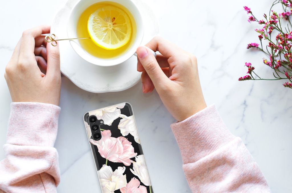 Een bosje bloemen doet een mens (en zijn smartphone) goed. De witte en roze bloemen op deze Samsung Galaxy A13 | A04s TPU Case geven jouw smartphone een zeer mooie uitstraling. Je wordt er ook meteen een stuk rustiger van als je aan het appen of aan het bellen bent. Valt dan je telefoon op de grond, dan zal er dankzij de tpu case met het design Lovely Flowers ontstaan. Helemaal niet als je er een screenprotector bij hebt gekocht. Onze tpu cases met roze en witte bloemen zien er zeer prettig uit en zijn heel praktisch, getuige onder meer de opstaande randen en het flexibele materiaal. Alleen de achterkant van de tpu case wordt bedrukt met roze en witte bloemen. Op deze tpu case kun je trouwens ook een eigen ontwerp zetten. In een paar simpele stappen ontwerp je zelf een stand case met daarop jouw favoriete bloemen.