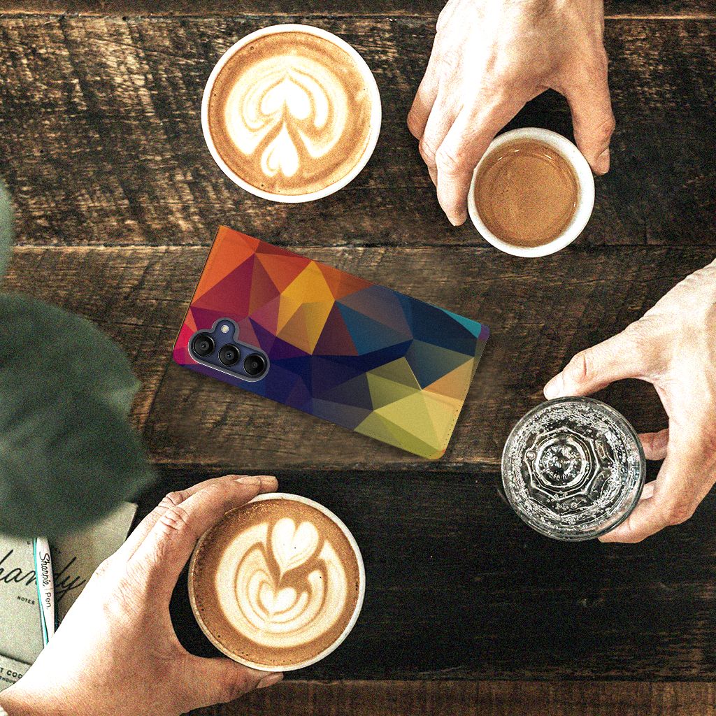 Veelkleurige driehoeken die samen eindeloze asymmetrische patronen lijken te vormen. Het is het abstracte schouwspel dat op dit fraaie hoesje voor je Samsung Galaxy A15 direct de aandacht trekt noemen we voor het gemak trekt noemen we voor het gemak Polygon Color. De een ziet er een berglandschap in, de ander piramides. Wat zie jij erin? Zeker is in elk geval dat de aanblik van dit fascinerende ontwerp je niet snel gaat vervelen. Het kleurige spel van lijnen en vlakken blijft eindeloos boeien en geeft jouw Stand Case een hippe en kunstzinnige uitstraling. De kracht die het lijnenspel uitstraalt, komt ook terug in het hoesje zelf. De solide hoes van PU-leer beschikt ook over een 1 pashouder en een speciale standaard. Het hoesje wordt afgesloten met een magneet aan de binnenzijde. De houder aan de binnenzijde is van TPU. Alle zijden worden bedrukt.