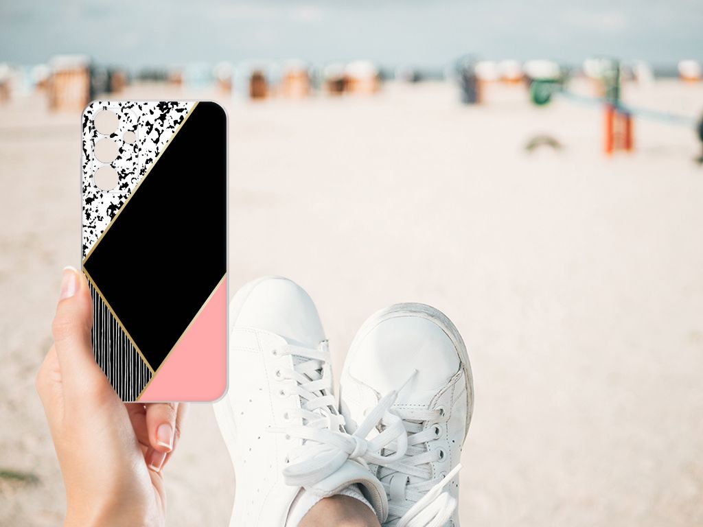- Met een tpu-siliconen hoesje met roze, zwarte en witte vlakken blijft jouw telefoon in tact.