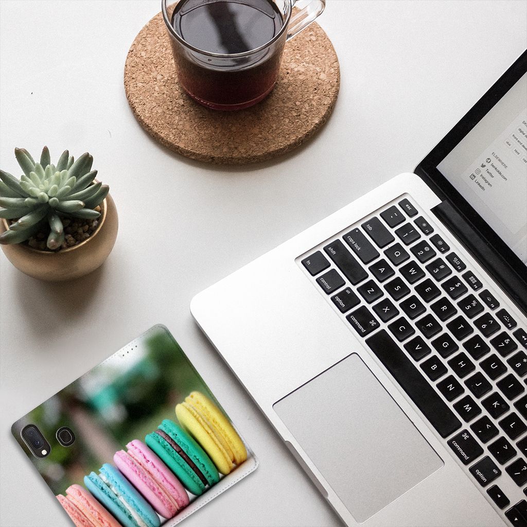 Dit stand hoesje met macarons is een zeer opvallende bescherming voor jouw smartphone. Macarons zijn Franse koekjes: kleine, rond en luchtig. Ze zijn aan elkaar geplakt met een zachte vulling. Ze worden in veel verschillende smaken gemaakt, herkenbaar aan de verschillende kleuren zoals chocolade (donkerbruin), mokka (middenbruin), kersen (rood), pistache (groen), aardbei (roze), framboos (karmijn), citroen (geel) en kokos (roomwit). Deze kleuren kun je natuurlijk ook zien op dit fraaie design hoesje met macarons. Heb je altijd al een Samsung Galaxy A20e Flip Style Cover willen hebben met macarons? Grijp dan nu je kans. Deze case heeft zeer veel goede eigenschappen, zoals 1 opbergvakje en een magnetische sluiting aan de binnenkant. Dit design hoesje met macarons wordt aan alle zijden bedrukt. De houder aan de binnenkant van het hoesje is van TPU. De case heeft ook een handige standaard.