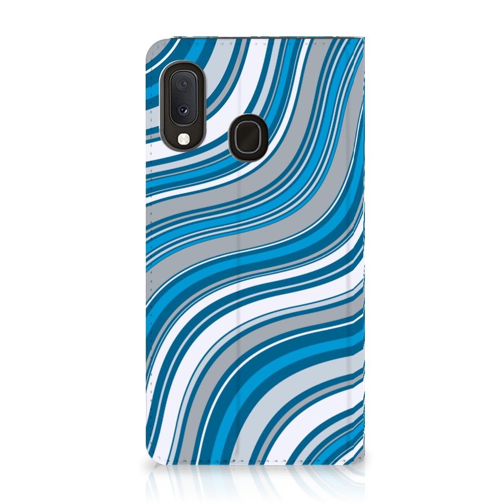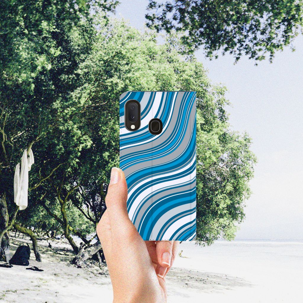 Zeer cool, dit hoesje met vooral blauwe kleuren, die in een golvende beweging jouw telefoon van een mooie uitstraling voorzien. Tijdens een zonnige vakantie aan zee is jouw smartphone perfect beschermd met dit telefoonhoesje. Het design Waves Blue van dit smartphone hoesje doet lichtjes denken aan een lolly, waarmee je een klein kind zeer blij maakt. Jouw Samsung Galaxy A20e zal er ook zeer vrolijk uitzien samen met dit design hoesje. De witte en grijze kleuren staan in mooi contrast met het blauw, waardoor de uitstraling van deze accessoire zeer mooi is. Ook voor andere kleuren kun je natuurlijk uitstekend terecht in ons assortiment. Het design staat op een Hoesje met Magneet. Deze case beschermt jouw telefoon aan alle kanten en beschikt over een 1 opbergvakje en een speciale standaard. Het hoesje wordt afgesloten met een magneet aan de binnenzijde. De houder aan de binnenzijde is van TPU.