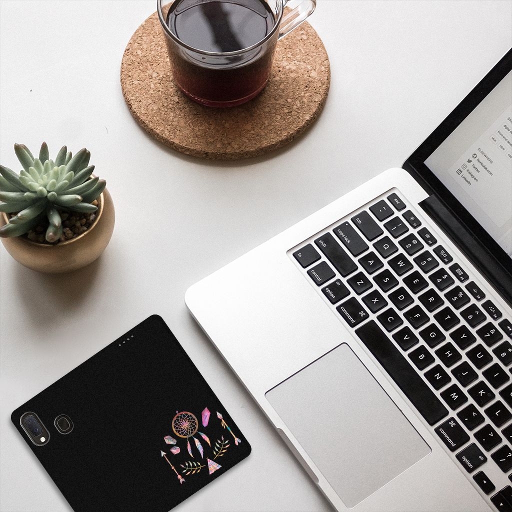Een dromenvanger werd lang geleden al door een indianenvolk in Noord-Amerika gebruikt om nare dromen te weren. Nu nog hangen mensen over de hele wereld dromenvangers boven hun bed. Maar ook op een telefoonhoesje staat zo’n boho dreamcatcher heel mooi. Dit mooie design dat bestaat uit een tipi, pijlen en dromenvanger heeft veel verschillende prachtige kleuren. Maar omdat het ontwerp minimalistisch en klein is, is het design toch subtiel te noemen. Dit ontwerp staat op een Magnet Case voor je Samsung Galaxy A20e. Dit populaire smartphonehoesje heeft één vakje voor een pasje of briefgeld en is aan alle zijden bedrukt. Met de standcase zet je je telefoon gemakkelijk neer, zodat je je handen vrij hebt als je bijvoorbeeld een video wilt kijken. De binnenkant van de standcase is van grijs PU-leer. Dat is fijn, omdat je daardoor niet snel vlekken ziet op je hoesje.