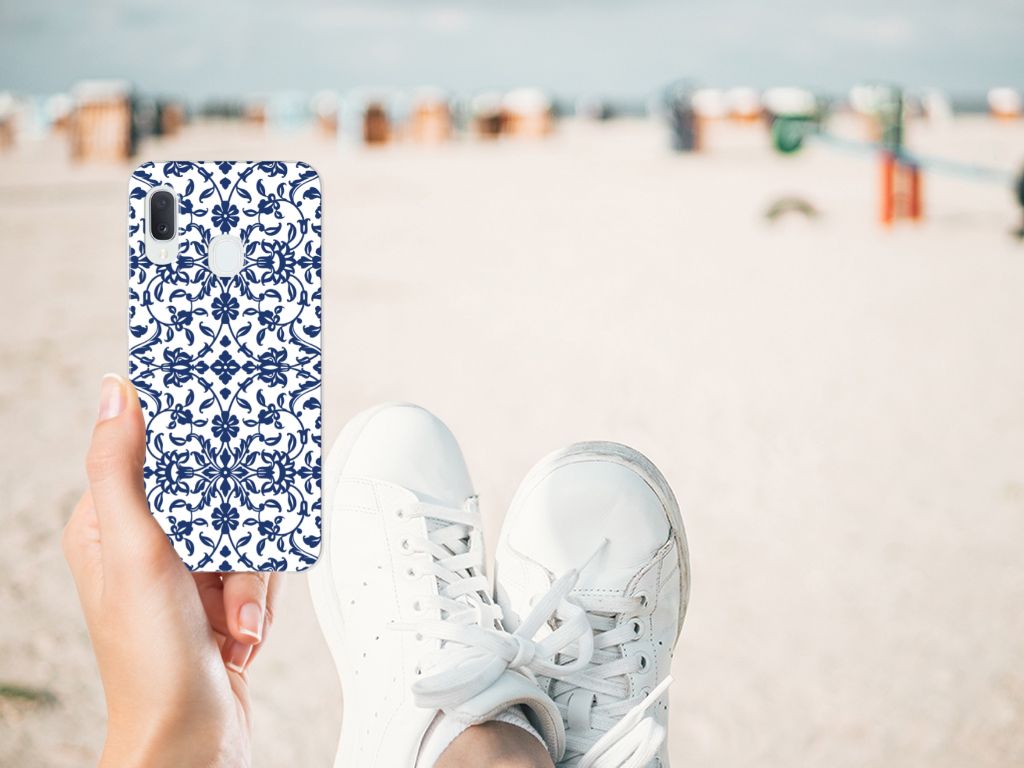 Een plaatje, deze Samsung Galaxy A20e TPU Case met Flower Blue patroon, die jouw telefoon van een hele mooie uitstraling voorziet. We hebben verschillende soorten patronen in de aanbieding waarmee we jouw hoesje kunnen verrijken, maar dit is wel een van de fraaiste. Maar natuurlijk heeft iedereen zo zijn eigen smaak. Vandaar dat we nog allerlei andere patronen kunnen aanbieden in de leukste kleurencombinaties. Het tpu hoesje met blauwwit patroon beschermt jouw telefoon vooral aan de achterkant en zijkanten en heeft opstaande randen aan de voorkant. De tpu case is zeer flexibel dankzij het elastische materiaal. Wij bedrukken de case in eigen beheer. De zijkanten van de tpu case blijven transparant en krijgen dus geen blauwwit patroon. Alleen de achterzijde van de hoes wordt bedrukt. Heb je een rijke fantasie? Ontwerp dan je eigen design hoesje met favoriet patroon.