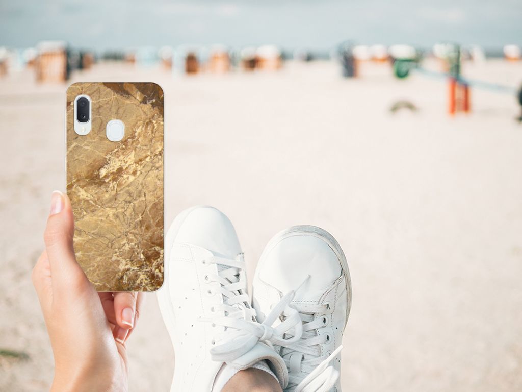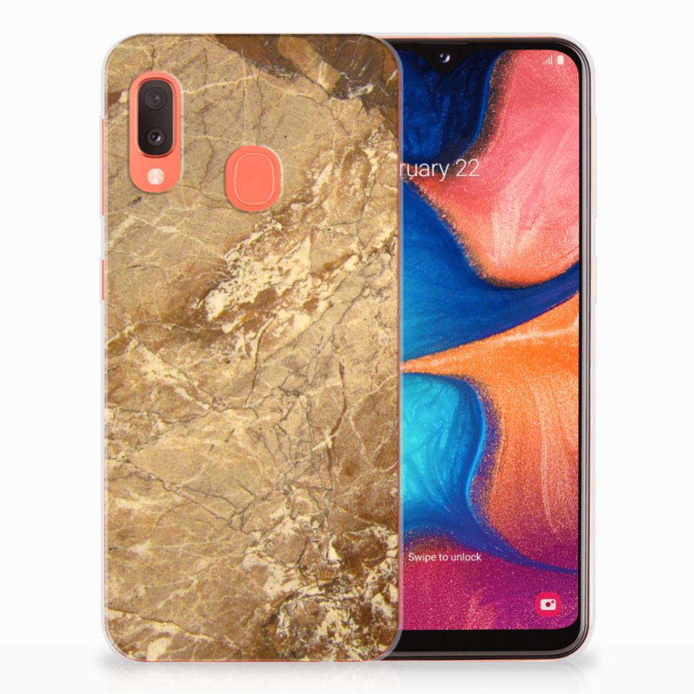 Dit design hoesje met Marmer in lichtbruine kleur is voor de artistiekelingen onder ons. De Grieken en Romeinen wisten het marmer al te waarderen door het in de bouw toe te passen. Naast het witte marmer zijn de diverse soorten marmer in een gevarieerde kleurensamenstelling te krijgen. We hebben verschillende mooie kleuren op design hoesjes gezet, zoals in dit geval het lichtbruine marmer. Dit is een Samsung Galaxy A20e TPU Siliconen Hoesje met marmer in lichtbruine kleur. Het marmer wordt bedrukt op de voorkant van een tpu case, die beschikt over opstaande randen aan de voorkant en heel goed combineert met een screenprotector van glas of van folie. Door de rijkdom aan kleuren en varianties in afwerking kunnen ontwerpers met marmer schitterende architectonische projecten realiseren. Wij hebben hetzelfde gedaan en onze ontwerper veel vrijheid geboden. Het resultaat zie je terug in deze tpu case met lichtbruin marmer, die jouw smartphone goed beschermt. De zijkanten van de case worden niet bedrukt met het lichtbruine marmer.