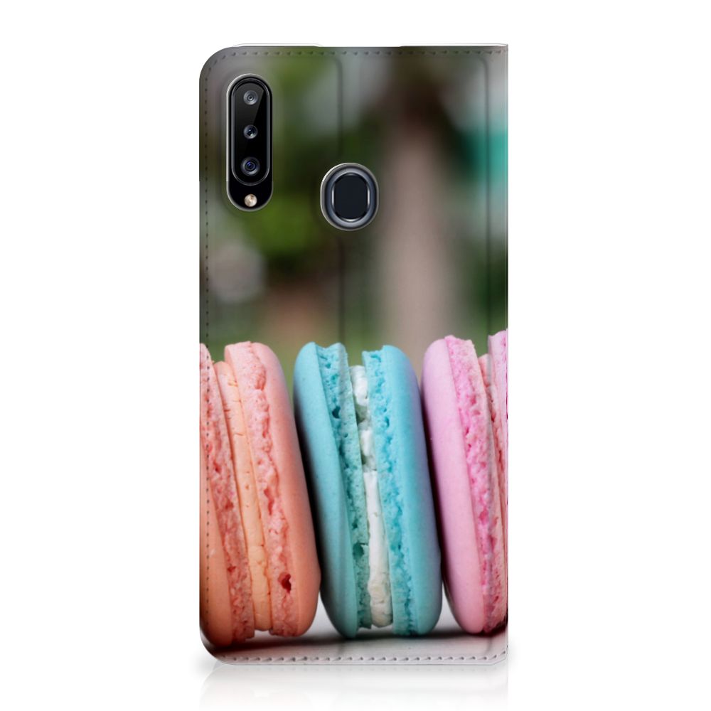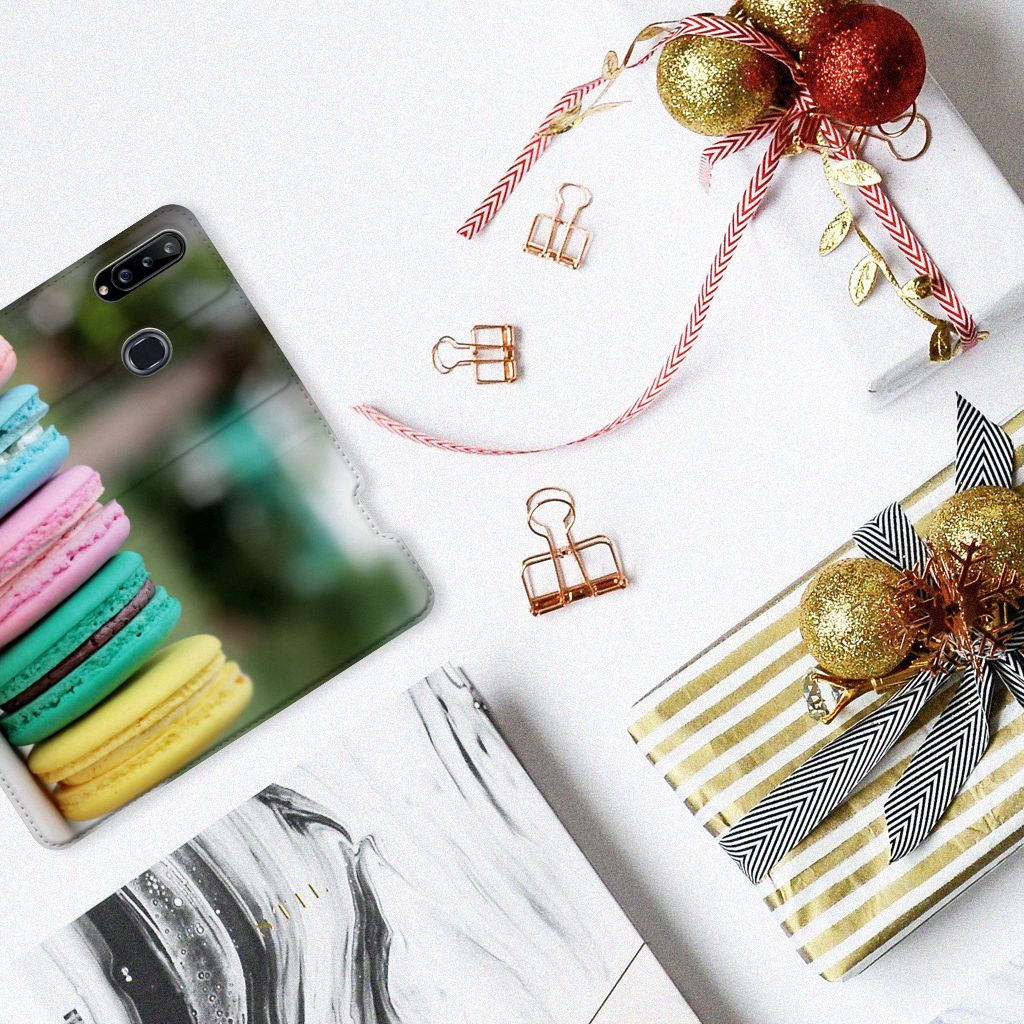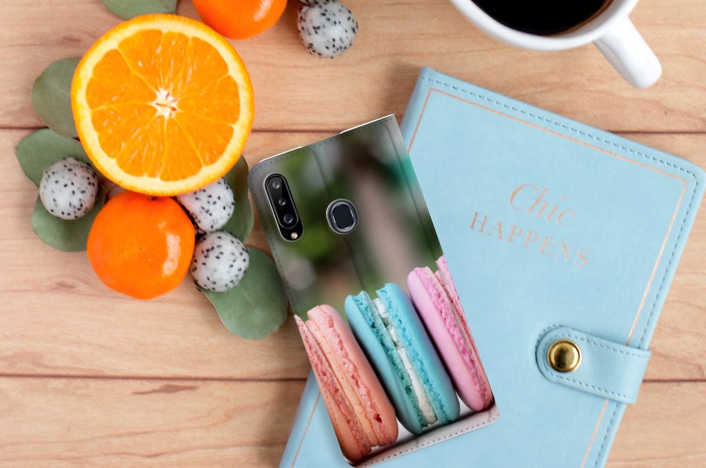 Dit stand hoesje met macarons is een zeer opvallende bescherming voor jouw smartphone. Macarons zijn Franse koekjes: kleine, rond en luchtig. Ze zijn aan elkaar geplakt met een zachte vulling. Ze worden in veel verschillende smaken gemaakt, herkenbaar aan de verschillende kleuren zoals chocolade (donkerbruin), mokka (middenbruin), kersen (rood), pistache (groen), aardbei (roze), framboos (karmijn), citroen (geel) en kokos (roomwit). Deze kleuren kun je natuurlijk ook zien op dit fraaie design hoesje met macarons. Heb je altijd al een Samsung Galaxy A20s Flip Style Cover willen hebben met macarons? Grijp dan nu je kans. Deze case heeft zeer veel goede eigenschappen, zoals 1 opbergvakje en een magnetische sluiting aan de binnenkant. Dit design hoesje met macarons wordt aan alle zijden bedrukt. De houder aan de binnenkant van het hoesje is van TPU. De case heeft ook een handige standaard.