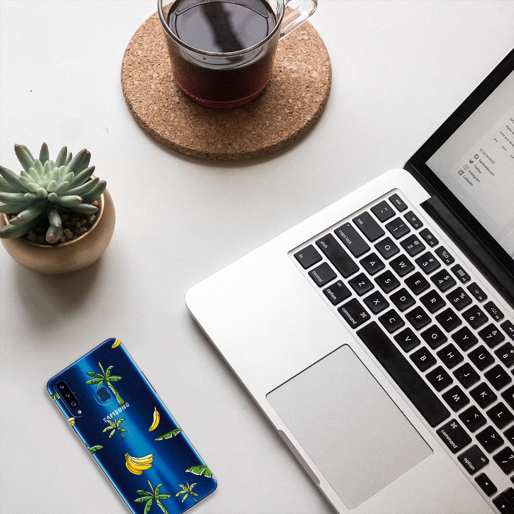 Heb jij al zin om op vakantie te gaan? Dat krijg je hoe dan ook als je één blik werpt op dit vrolijke hoesje voor je Samsung Galaxy A20s met Banana Tree design. Het fleurige tafereel van bananenbomen, bananenbladeren en bananen doet je gedachten afdwalen naar paradijselijke bountystranden met azuurblauwe zee en helderwitte zandpartijen. Kortom: dit hoesje is goed voor je humeur. Naast het luchtige design zijn daar nog meer redenen voor, want dankzij de stevige materialen weet je zeker dat dit TPU Case je telefoon altijd optimaal beschermt Dit hoesje wordt alleen aan de bovenkant bedrukt en is zeer flexibel. De randen van het hoesje blijven transparant. Met dit hoesje breng je jezelf in zomerse sferen en gun je jezelf een krasvrije telefoon.