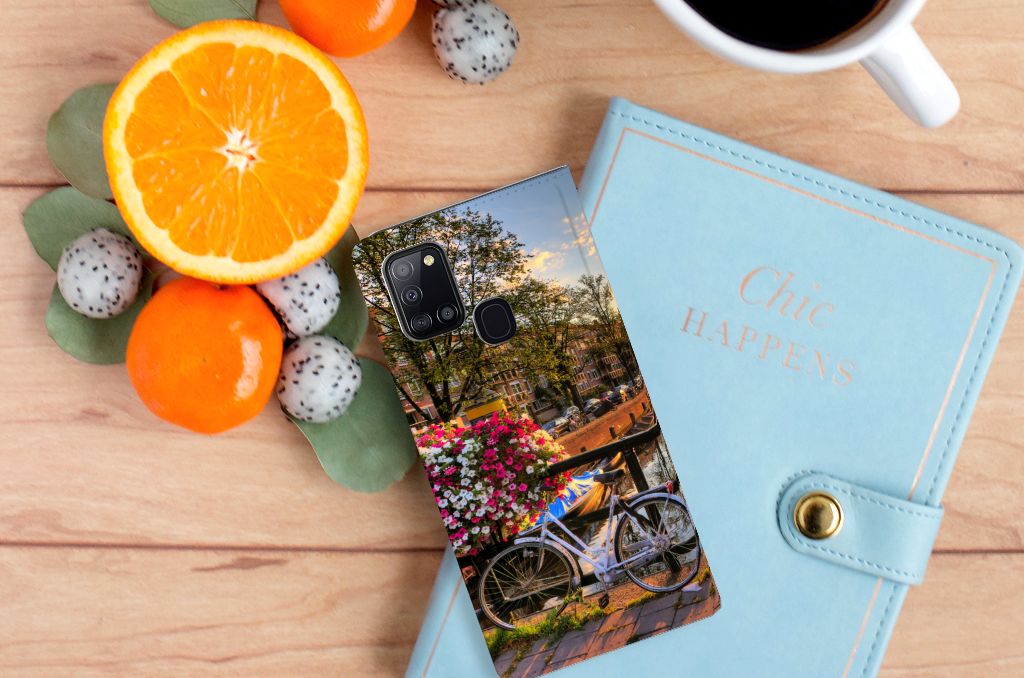 Amsterdam is meer dan ooit een toeristische trekpleister. Een bezoek aan de hoofdstad is niet compleet als er geen bezoek is gebracht aan de Amsterdamse Grachten. Ze zijn een symbool van de stad en hebben een enorme culturele en historische waarde. Daarom kunnen ze natuurlijk niet ontbreken in onze collectie design hoesjes. Dit schitterende design hoesje met Amsterdamse grachten tref je enkel en alleen aan bij B2C Telecom. De ondergaande zon en de fleurige en fraaie bloempakketten zorgen voor een prachtig totaalplaatje. Amsterdam is wereldberoemd om haar prachtige grachten uit de zeventiende eeuw. Dit smartphone hoesje is hier een eerbetoon aan. Het design staat op een stand case. Deze Samsung Galaxy A21s Book Cover beschermt jouw telefoon aan alle kanten en beschikt over een 1 opbergvakje en een speciale standaard. Het hoesje wordt afgesloten met een magneet aan de binnenzijde. De houder aan de binnenzijde is van TPU. Alle zijden van de stand case worden bedrukt.