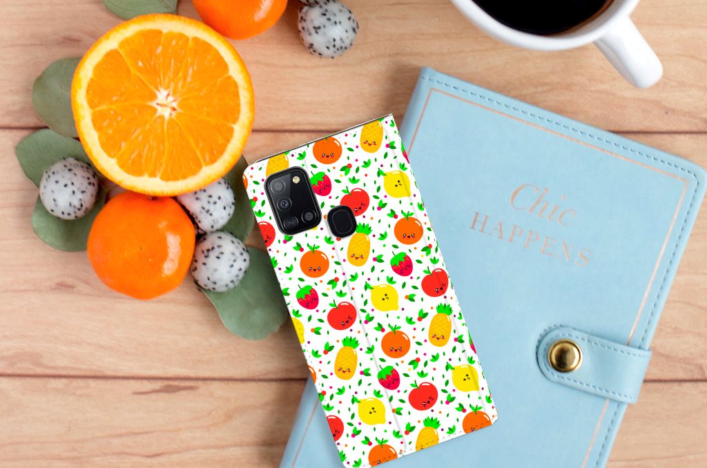 Een fris, fruitig en vrolijk hoesje, deze case met afbeeldingen van aardbeien, ananassen, appels, sinaasappels en citroenen. Minstens twee stuks fruit per dag wordt aanbevolen als dagelijkse hoeveelheid voor de mens. Dit verkleint de kans op allerlei ziekten. Dus met het aantal stukken fruit op de Samsung Galaxy A21s Flip Style Cover zou je wel een maandje zoet moeten zijn. Met het hoesje zelf kun je je hele leven doen, dit is namelijk niet stuk te krijgen. Dit komt door het sterke en flexibele materiaal waarvan het gemaakt is. De vrolijk stemmende case het desing Fruits maakt jouw telefoon dus zeer duurzaam. Zorg ervoor dat jouw smartphone gezond blijft en kies voor dit hoesje met frivool fruit. Een stand case met fruit beschermt jouw telefoon aan alle kanten en beschikt over een 1 opbergvakje en een speciale standaard. Het hoesje met fruit wordt afgesloten met een magneet aan de binnenzijde. De houder aan de binnenzijde is van TPU.
