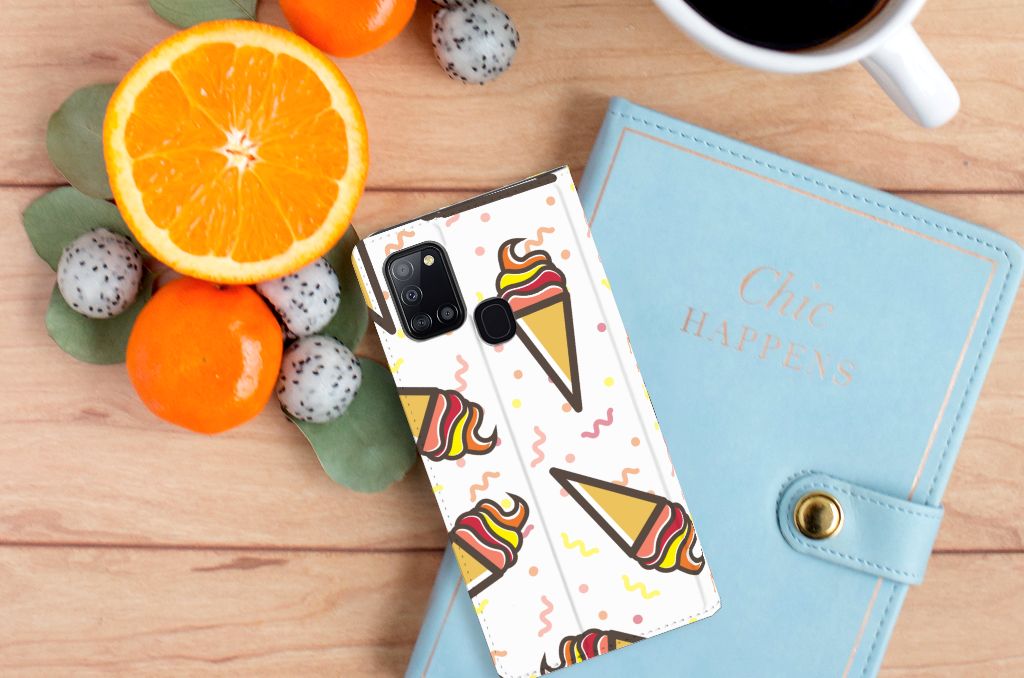 Een vrolijke Samsung Galaxy A21s Flip Style Cover met daarop verschillende ijsjes. Als je daar geen zomers gevoel meer van krijgt, weten wij het ook niet meer. De zomer en ijsjes zijn onlosmakelijk met elkaar verbonden. Tijdens een bezoekje aan het strand mag een lekker ijsje bijvoorbeeld niet ontbreken. Een design hoesje met lekkere Icecream print past daar natuurlijk ook ontzettend goed bij. Jouw telefoon is helemaal beschermd met een stand case met ijsjes design. De aankoop van deze case is een heerlijke investering, die zich gegarandeerd terugbetaalt. Alle zijden van dit hoesje worden bedrukt met ijsjes. De case heeft een speciale standaard en de houder aan de binnenzijde is van TPU. Onder alle weersomstandigheden zal deze case met opbergvakje perfect functioneren, ook in de zomer met een ijsje in je hand. Dit smaakvolle hoesje is zeer goedkoop te bestellen en wordt zeer snel bezorgd.