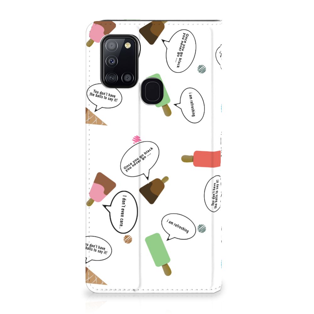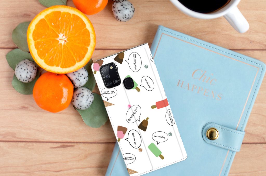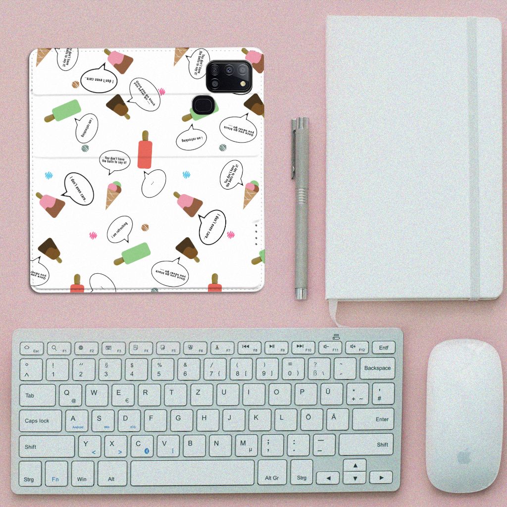 Van deze vrolijke Samsung Galaxy A21s Flip Style Cover met daarop verschillende soorten ijsjes met tekstwolkjes krijg je sowieso een vrij en zomers gevoel. De zomer komt naar je toe met deze print van ijsjes met tekstwolkjes. Ben je op het strand, dan ontbreekt een lekker ijsje natuurlijk niet. Net zoals je je smartphone bij de hand hebt, met daaromheen een design hoesje met bijzondere ijsjes en tekstwolkjes. Jouw telefoon kan dan de bescherming in de vorm van een stand case met ijsjes zeer goed gebruiken. Alle zijden van dit hoesje worden bedrukt met ijsjes en dankzij de speciale standaard is het erg prettig om filmpjes te bekijken. De case wordt aan de binnenzijde met een magneet afgesloten en de houder aan de binnenzijde is van TPU. Onder alle weersomstandigheden zal deze case met 1 opbergvakje en ijsjes perfect functioneren, ook op het strand met een ijsje in je hand.
