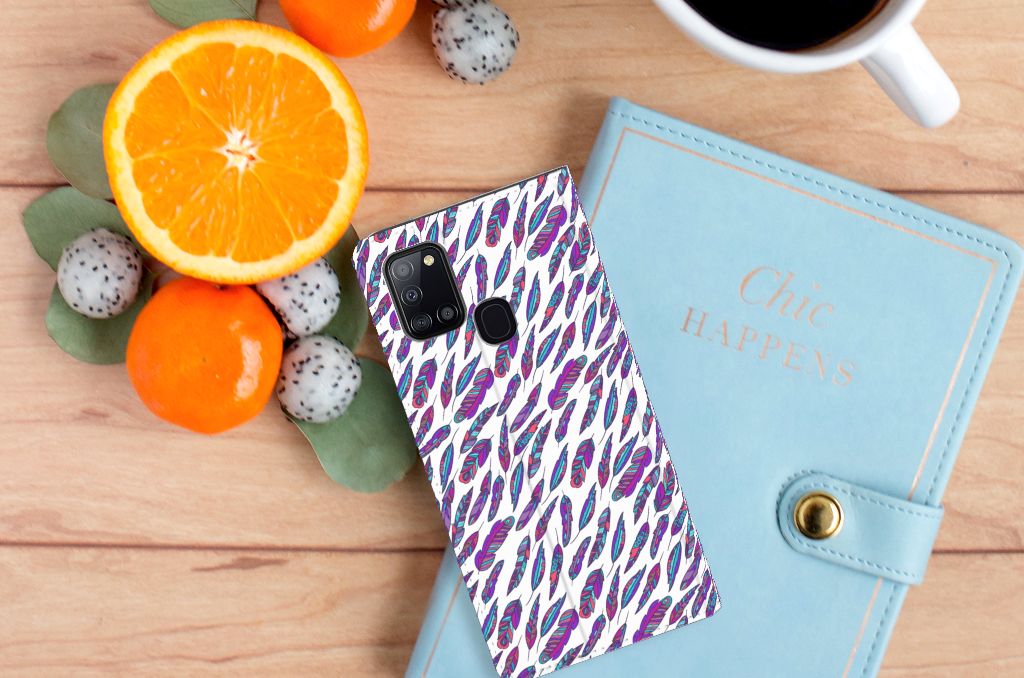 Ben je op zoek naar een uniek telefoonhoesje voor je Samsung Galaxy A21s? Dan ben je bij B2C Telecom aan het juiste adres! Speciaal voor jou hebben we dit prachtige Feathers Color design in onze collectie hoesjes opgenomen. Het design wordt bedrukt op een Hoesje met Magneet en heeft een vakje aan de binnenkant voor een pasje. Het fijne aan dit hoesje is dat je het als standaard neer kunt zetten. Hierdoor geniet je nog meer als je een filmpje aan het kijken bent op je telefoon. Het hoesje wordt afgesloten door magneten aan de binnenkant. Wil je dit design hoesje nog iets extra's geven? Voeg dan gratis je naam of een quote toe! Is dit design hoesje toch niet helemaal wat je zocht? Ontwerp dan zelf een hoesje in ons ontwerpprogramma.